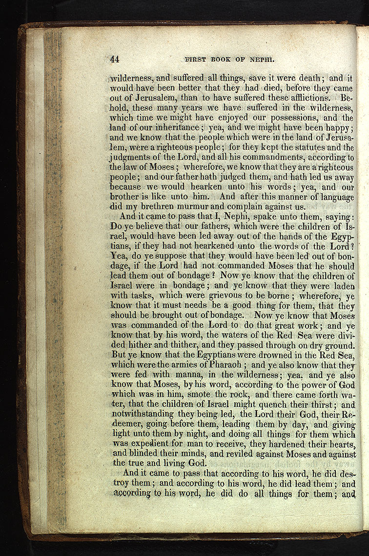 And it came to pass that I, Nephi, spake unto them, saying: Do ye believe that our fathers, which were the children of Israel, would have been led away out of the hands of the Egyptians, if they had not hearkened unto the words of the Lord? Yea, do ye suppose that they would have been led out of bondage, if the Lord had not commanded Moses that he should lead them out of bondage? Now ye know that the children of Israel were in bondage; and ye know that they were laden with tasks, which were grievous to be borne; wherefore, ye know that it must needs be a good thing for them, that they should be brought out of bondage. Now ye know that Moses was commanded of the Lord to do that great work; and ye know that by his word, the waters of the Red Sea were divided hither and thither, and they passed through on dry ground. But ye know that the Egyptians were drowned in the Red Sea, which were the armies of Pharaoh; and ye also know that they were fed with manna, in the wilderness; yea, and ye also know that Moses, by his word, according to the power of God which was in him, smote the rock, and there came forth water, that the children of Israel might quench their thirst; and notwithstanding they being led, the Lord their God, their Redeemer, going before them, leading them by day, and giving light unto them by night, and doing all things for them which was expedient for man to receive, they hardened their hearts, and blinded their minds, and reviled against Moses and against the true and living God.