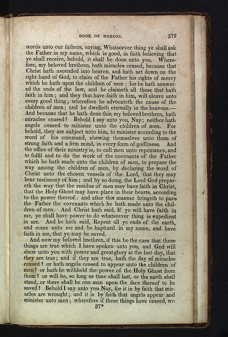 And now my beloved brethren, if this be the case that these things are true which I have spoken unto you, and God will shew unto you with power and great glory at the last day, that they are true; and if they are true, hath the day of miracles ceased? or hath angels ceased to appear unto the children of men? or hath he withheld the power of the Holy Ghost from them? or will he, so long as time shall last, or the earth shall stand, or there shall be one man upon the face thereof to be saved? Behold I say unto you Nay, for it is by faith that miracles are wrought; and it is by faith that angels appear and minister unto men; wherefore if these things have ceased, wo [p. 579]