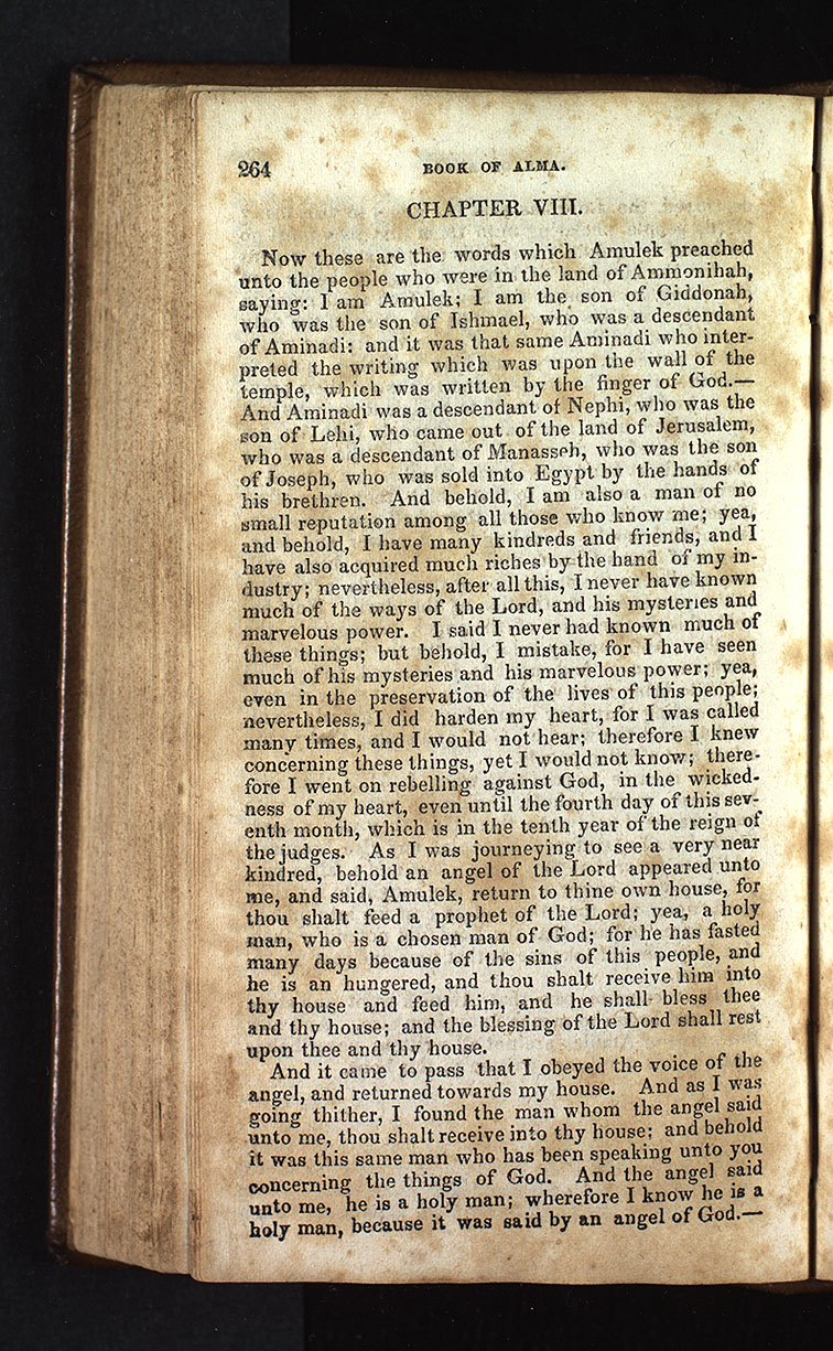 And it came to pass that I obeyed the voice of the angel, and returned towards my house. And as I was going thither, I found the man whom the angel said unto me, thou shalt receive into thy house; and behold it was this same man who has been speaking unto you concerning the things of God. And the angel said unto me, he is a holy man; wherefore I know he is a holy man, because it was said by an angel of God.— [p. 264]