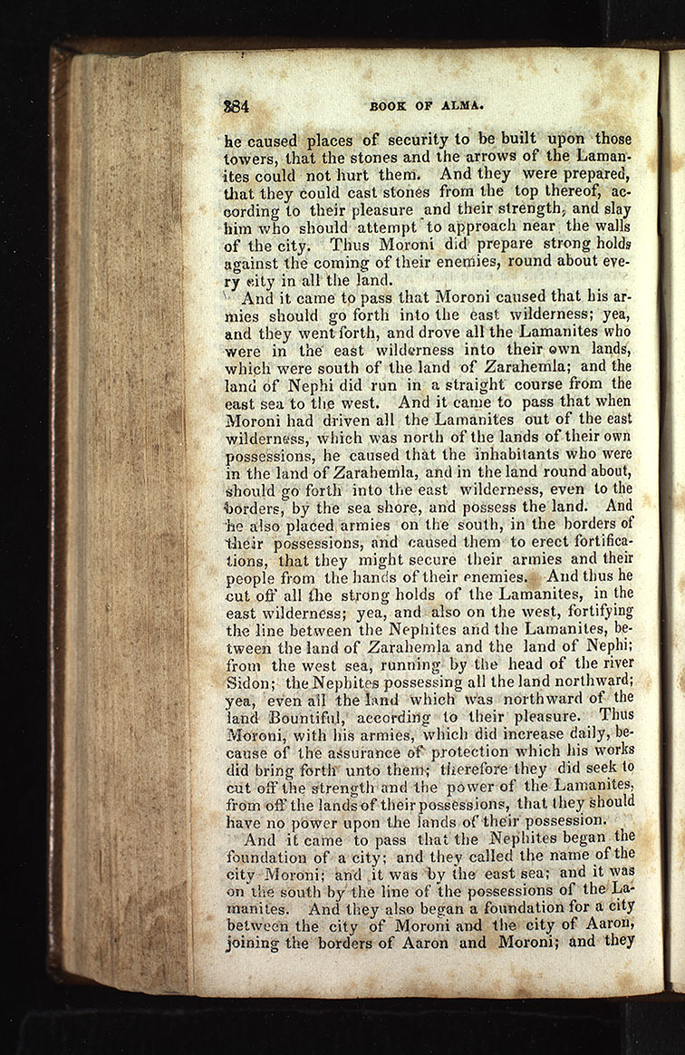 And it came to pass that the Nephites began the foundation of a city; and they called the name of the city Moroni; and it was by the east sea; and it was on the south by the line of the possessions of the Lamanites. And they also began a foundation for a city between the city of Moroni and the city of Aaron, joining the borders of Aaron and Moroni; and they [p. 384]