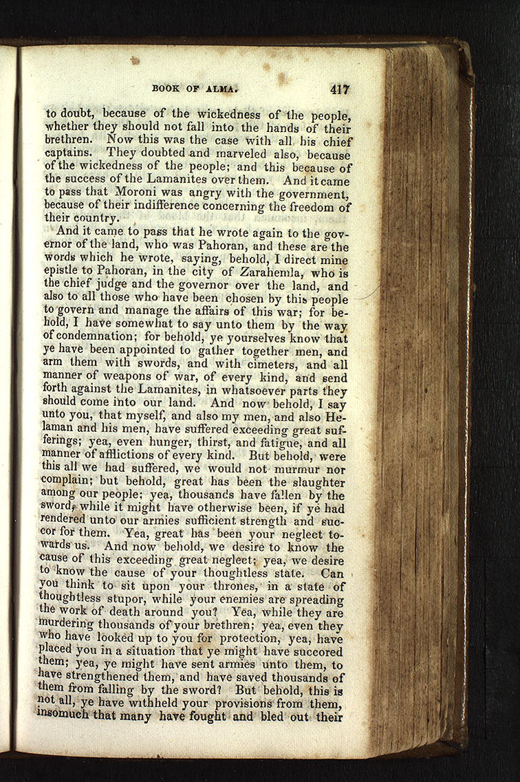 And it came to pass that he wrote again to the governor of the land, who was Pahoran, and these are the words which he wrote, saying, behold, I direct mine epistle to Pahoran, in the city of Zarahemla, who is the chief judge and the governor over the land, and also to all those who have been chosen by this people to govern and manage the affairs of this war; for behold, I have somewhat to say unto them by the way of condemnation; for behold, ye yourselves know that ye have been appointed to gather together men, and arm them with swords, and with cimeters, and all manner of weapons of war, of every kind, and send forth against the Lamanites, in whatsoever parts they should come into our land. And now behold, I say unto you, that myself, and also my men, and also Helaman and his men, have suffered exceeding great sufferings; yea, even hunger, thirst, and fatigue, and all manner of afflictions of every kind. But behold, were this all we had suffered, we would not murmur nor complain; but behold, great has been the slaughter among our people; yea, thousands have fallen by the sword, while it might have otherwise been, if ye had rendered unto our armies sufficient strength and succor for them. Yea, great has been your neglect towards us. And now behold, we desire to know the cause of this exceeding great neglect; yea, we desire to know the cause of your thoughtless state. Can you think to sit upon your thrones, in a state of thoughtless stupor, while your enemies are spreading the work of death around you? Yea, while they are murdering thousands of your brethren; yea, even they who have looked up to you for protection, yea, have placed you in a situation that ye might have succored them; yea, ye might have sent armies unto them, to have strengthened them, and have saved thousands of them from falling by the sword? But behold, this is not all, ye have withheld your provisions from them, insomuch that many have fought and bled out their [p. 417]