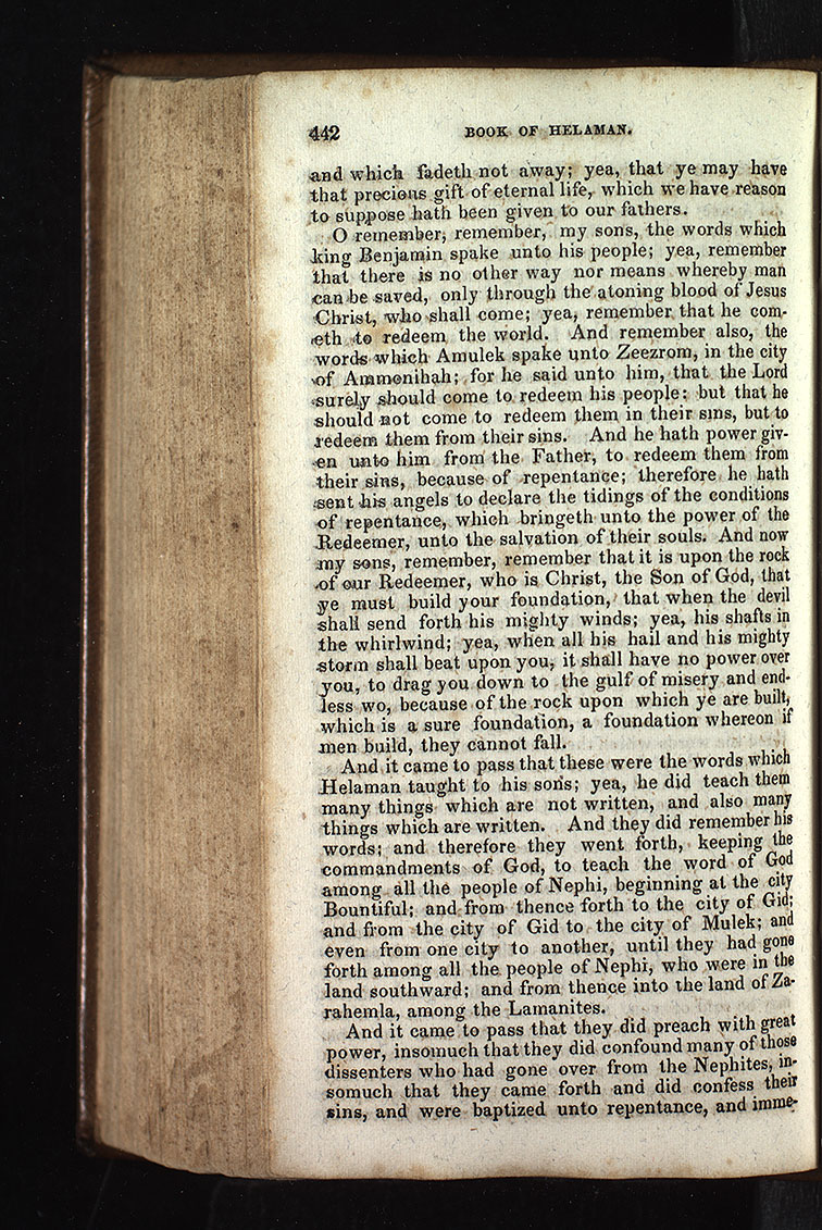 The Book of Mormon: An Account Written by the Hand of Mormon, upon Plates Taken from the Plates of Nephi. Kirtland, OH: P. P. Pratt and J. Goodson; printed by O. Cowdery & Co., 1837. iii–vi, 7–619 pp., plus two additional pp. The copy used herein is held at CHL. Includes signature marks.