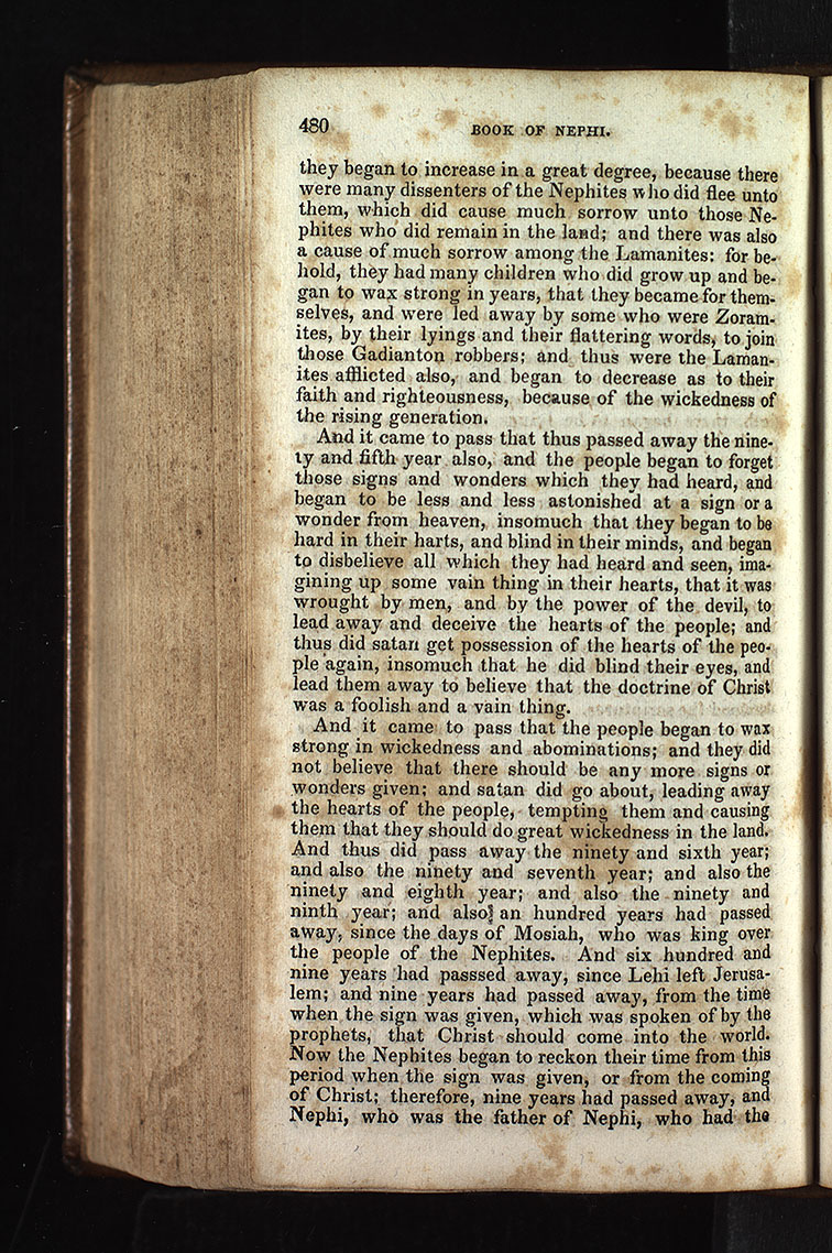 And it came to pass that the people began to wax strong in wickedness and abominations; and they did not believe that there should be any more signs or wonders given; and satan did go about, leading away the hearts of the people, tempting them and causing them that they should do great wickedness in the land. And thus did pass away the ninety and sixth year; and also the ninety and seventh year; and also the ninety and eighth year; and also the ninety and ninth year; and also an hundred years had passed away, since the days of Mosiah, who was king over the people of the Nephites. And six hundred and nine years had passsed away, since Lehi left Jerusalem; and nine years had passed away, from the time when the sign was given, which was spoken of by the prophets, that Christ should come into the world. Now the Nephites began to reckon their time from this period when the sign was given, or from the coming of Christ; therefore, nine years had passed away, and Nephi, who was the father of Nephi, who had the [p. 480]