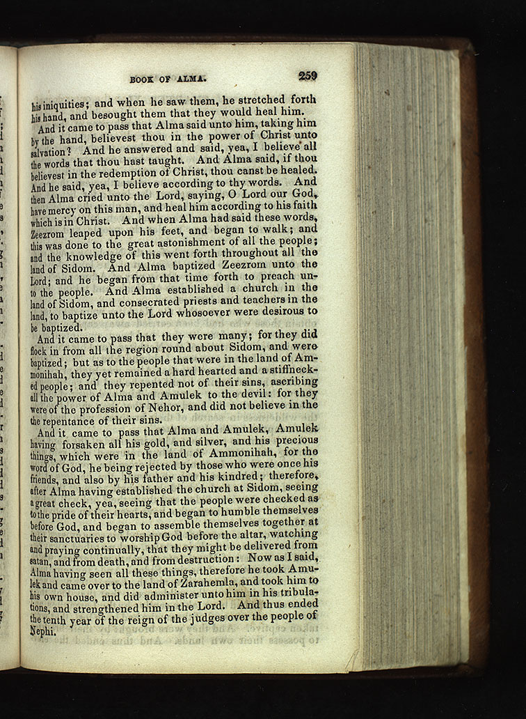 The Book of Mormon: An Account Written by the Hand of Mormon, upon Plates Taken from the Plates of Nephi. Nauvoo, IL: Robinson and Smith; stereotyped by Shepard and Stearns, 1840. iii–vi, 7–571 pp., plus two additional pp. The copy used herein is held at CHL.