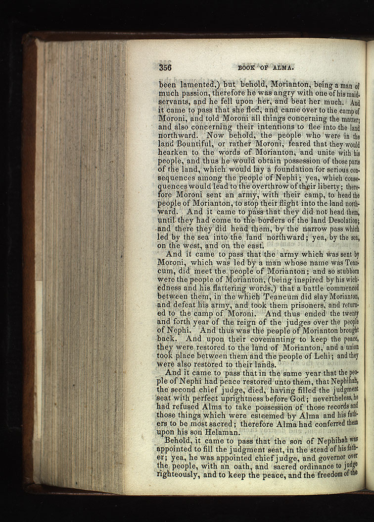 The Book of Mormon: An Account Written by the Hand of Mormon, upon Plates Taken from the Plates of Nephi. Nauvoo, IL: Robinson and Smith; stereotyped by Shepard and Stearns, 1840. iii–vi, 7–571 pp., plus two additional pp. The copy used herein is held at CHL.
