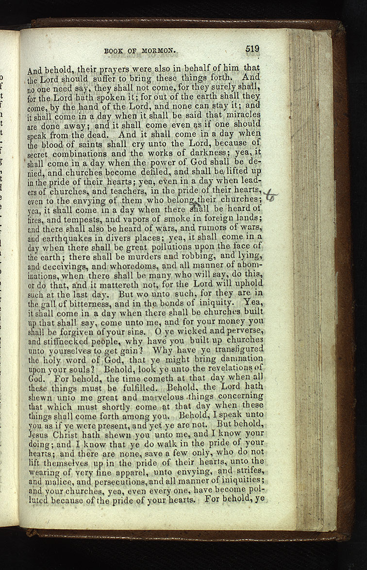 The Book of Mormon: An Account Written by the Hand of Mormon, upon Plates Taken from the Plates of Nephi. Nauvoo, IL: Robinson and Smith; stereotyped by Shepard and Stearns, 1840. iii–vi, 7–571 pp., plus two additional pp. The copy used herein is held at CHL.