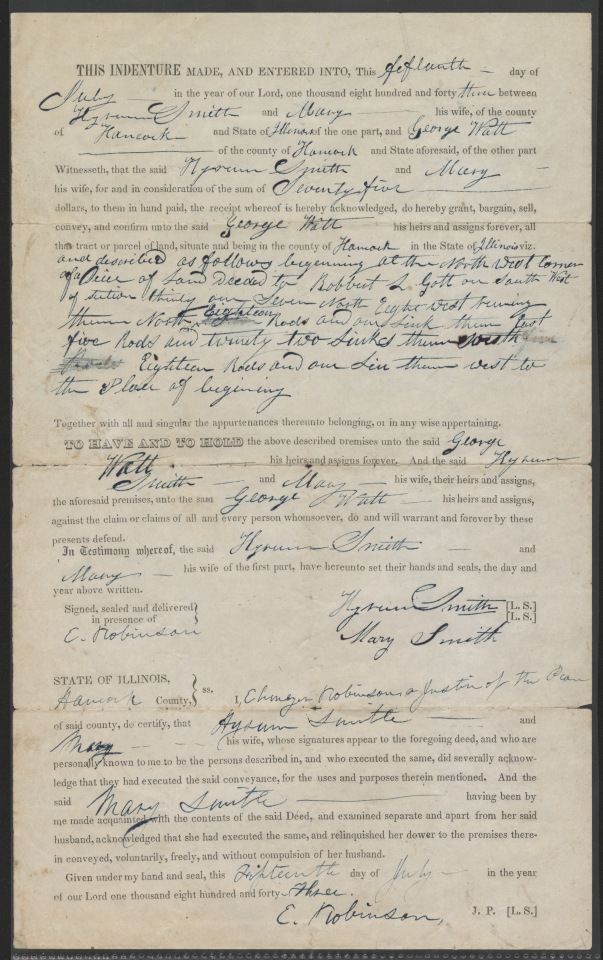 and , Deed for property in , Hancock Co., IL, to , 1 Mar. 1844; printed form with manuscript additions in handwriting of ; signatures of and ; certified by , 15 July 1843; certified by on behalf of JS, 1 Mar. 1844; docket in handwriting of ; notations in handwriting of ; two pages; George D. Watt Collection, CHL.