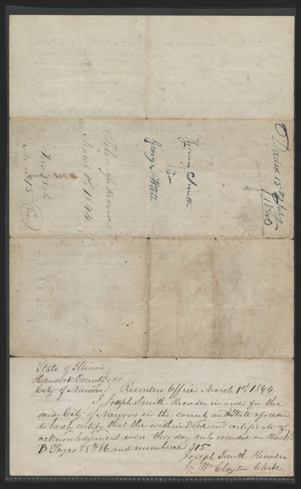and , Deed for property in , Hancock Co., IL, to , 1 Mar. 1844; printed form with manuscript additions in handwriting of ; signatures of and ; certified by , 15 July 1843; certified by on behalf of JS, 1 Mar. 1844; docket in handwriting of ; notations in handwriting of ; two pages; George D. Watt Collection, CHL.
