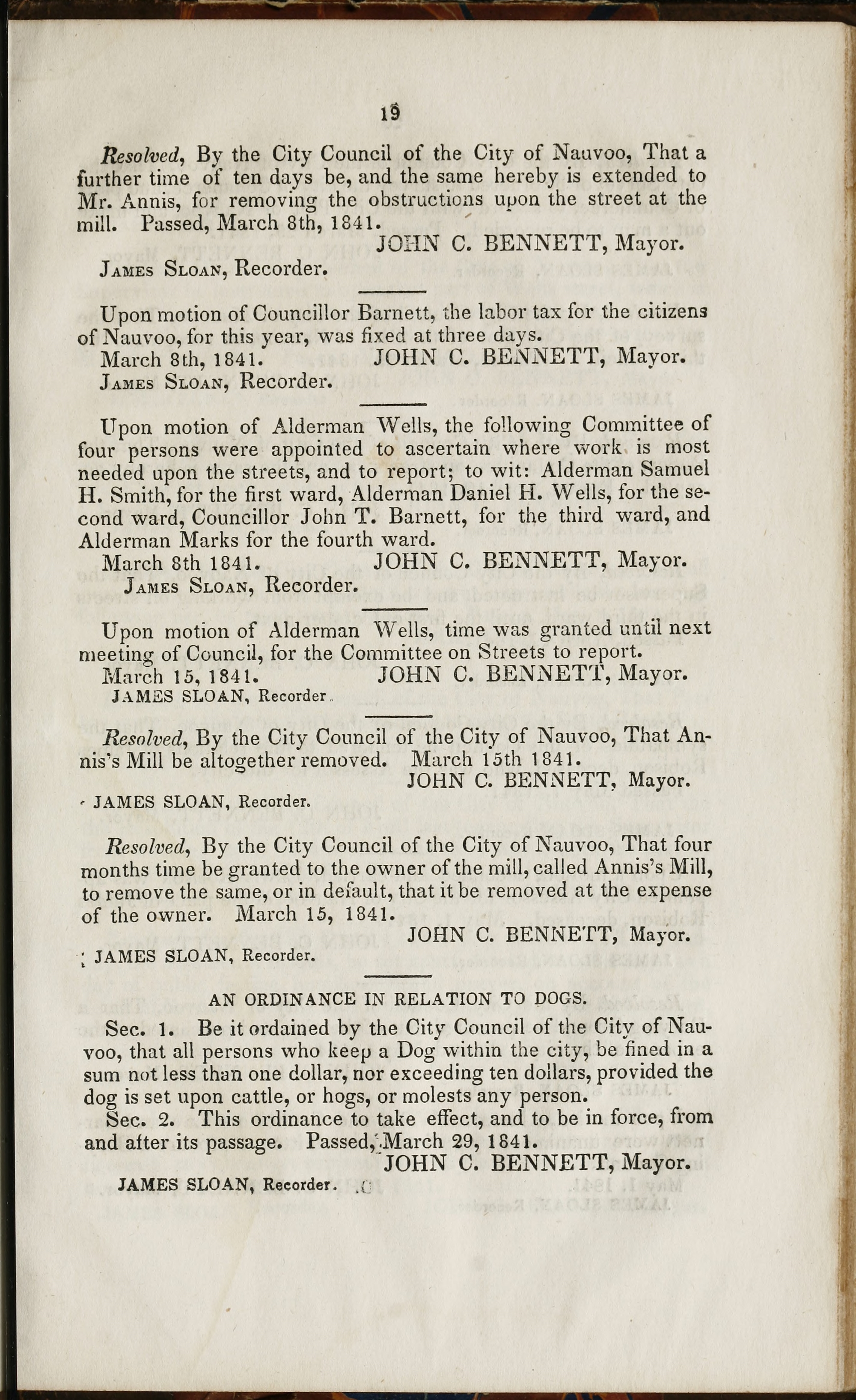 Resolved, By the City Council of the City of , That ’s Mill be altogether removed. March 15th 1841.