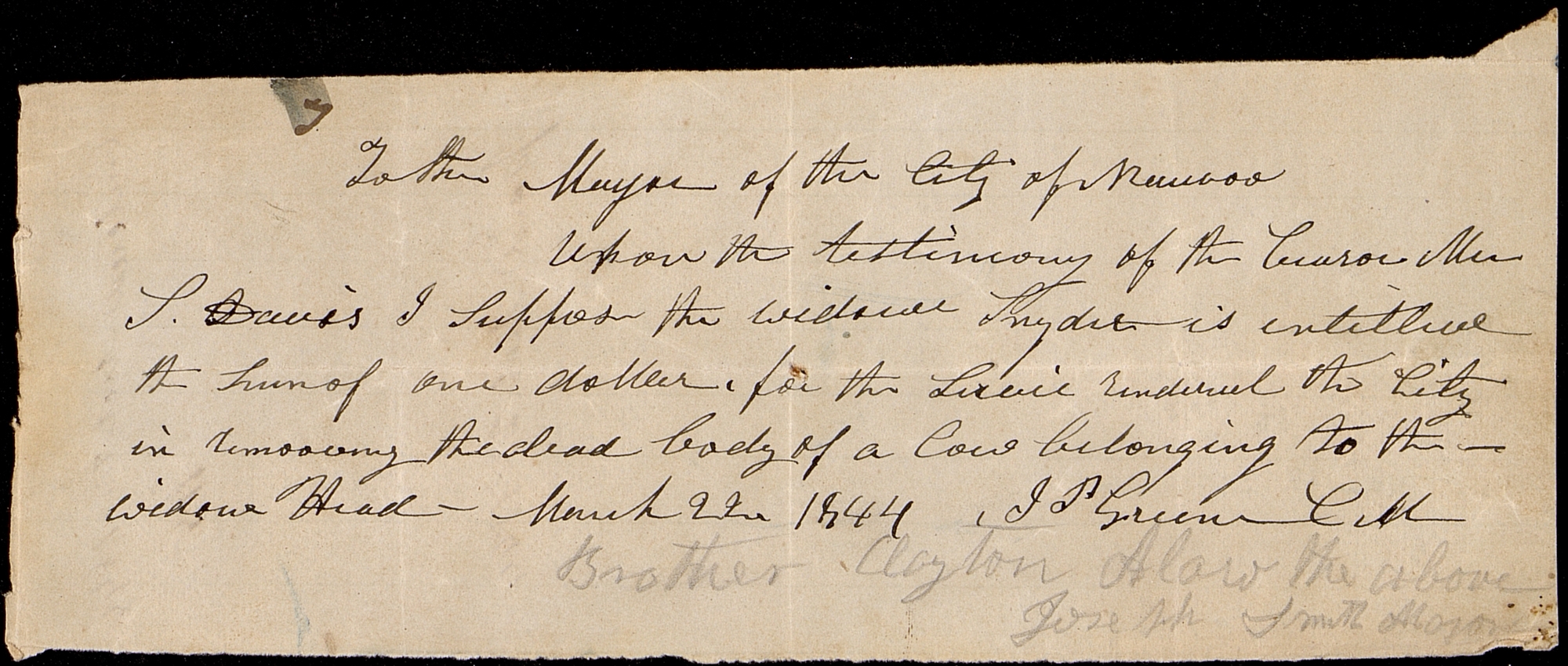Upon the testimony of the bearor Mrs S. Davis I suppos the widowe Snyder is entitled the sum of one dollar, for the Servic rendered the in remooving the dead body of a Cow belonging to the widow Head— March 22 1844