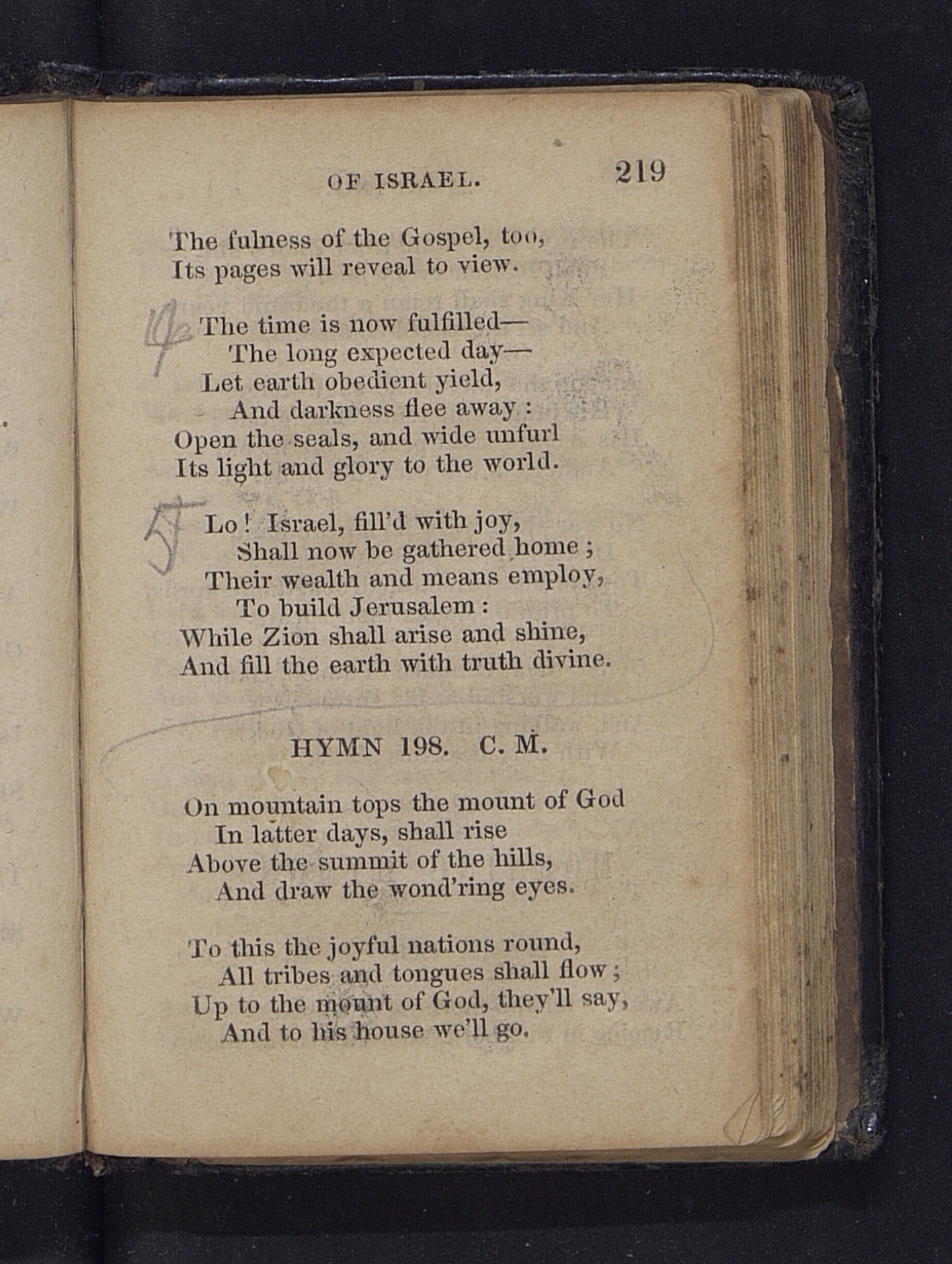 , , and , comps., A Collection of Sacred Hymns for the Church of Jesus Christ of Latter Day Saints, in Europe Manchester, England: W. R. Thomas, 1840, [1]–336. The copy used herein is held at CHL. Includes archival markings and redactions.