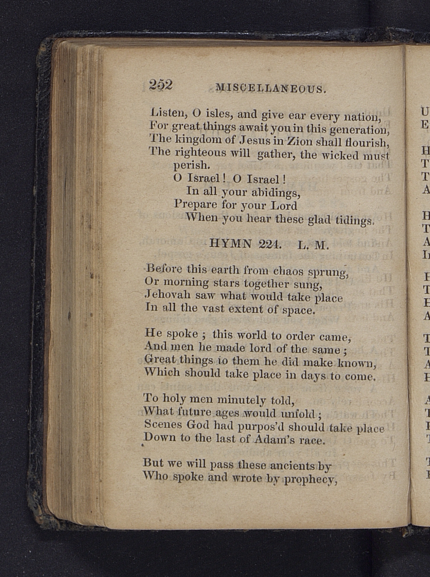 , , and , comps., A Collection of Sacred Hymns for the Church of Jesus Christ of Latter Day Saints, in Europe Manchester, England: W. R. Thomas, 1840, [1]–336. The copy used herein is held at CHL. Includes archival markings and redactions.