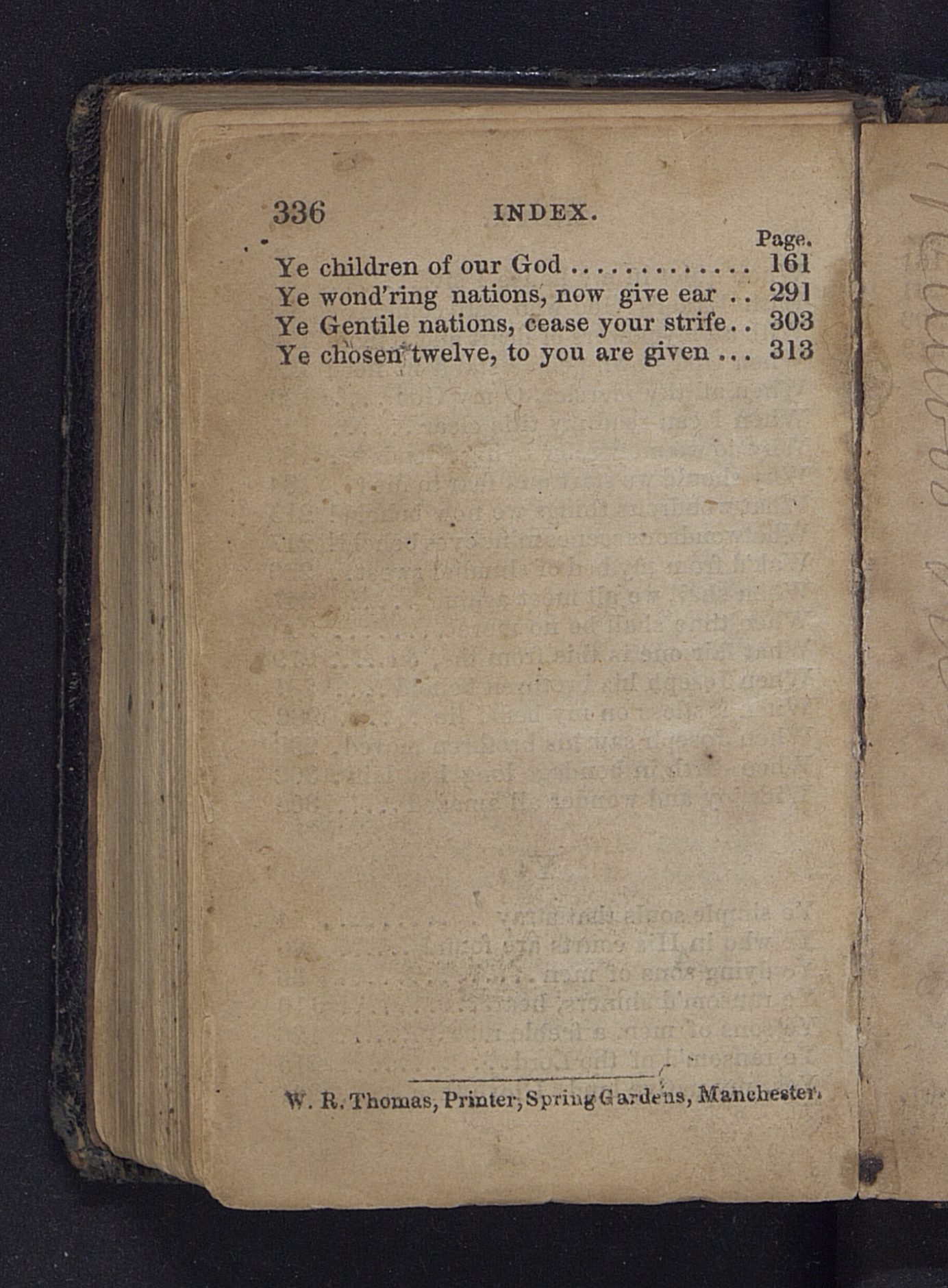 , , and , comps., A Collection of Sacred Hymns for the Church of Jesus Christ of Latter Day Saints, in Europe Manchester, England: W. R. Thomas, 1840, [1]–336. The copy used herein is held at CHL. Includes archival markings and redactions.