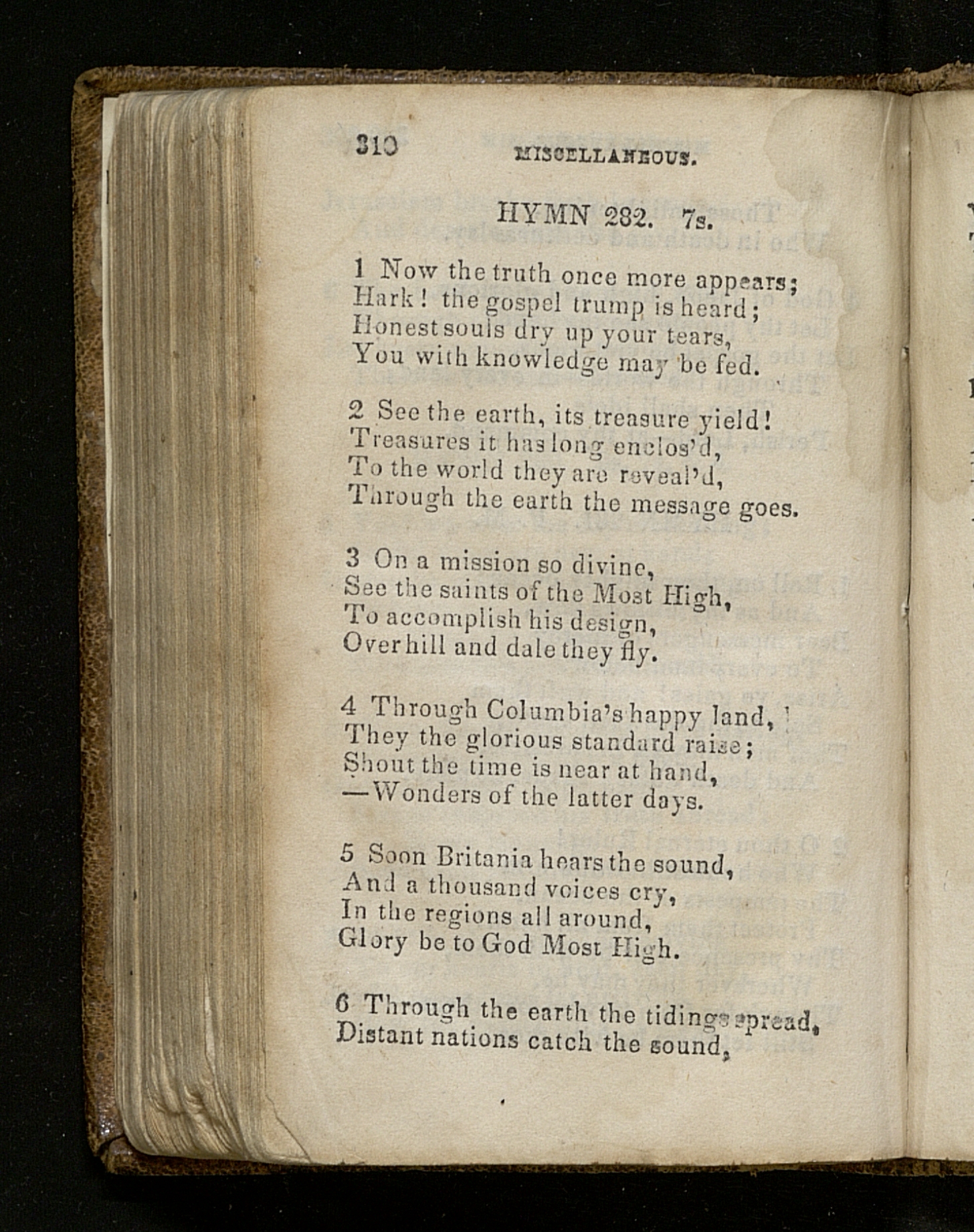 , comp., A Collection of Sacred Hymns for the Church of Jesus Christ of Latter Day Saints, Nauvoo, IL: E. Robinson, 1841, [i]–iv, 5–351. The copy used herein is held at CHL. Includes archival markings.