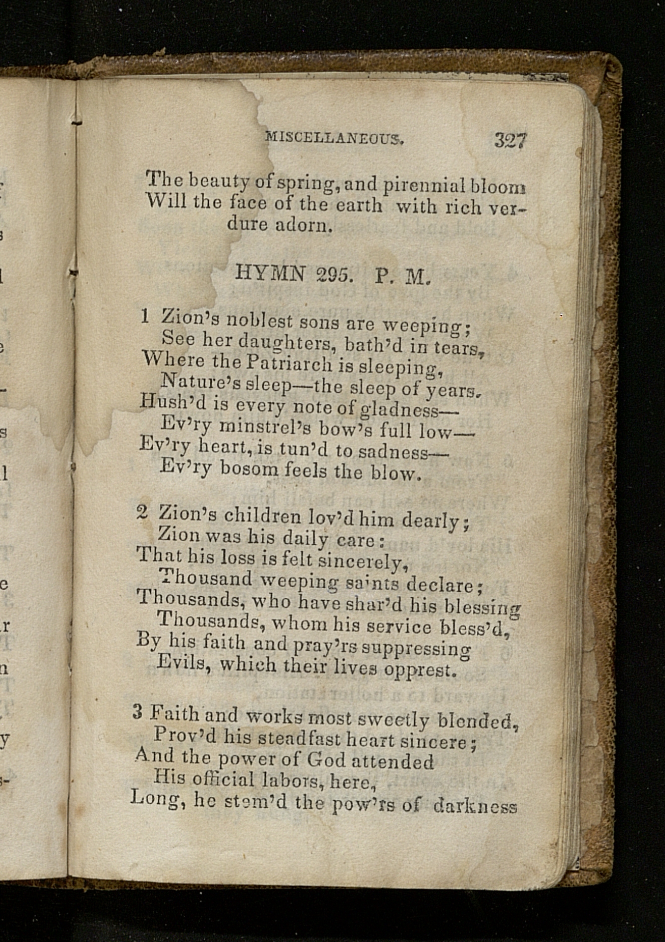 , comp., A Collection of Sacred Hymns for the Church of Jesus Christ of Latter Day Saints, Nauvoo, IL: E. Robinson, 1841, [i]–iv, 5–351. The copy used herein is held at CHL. Includes archival markings.