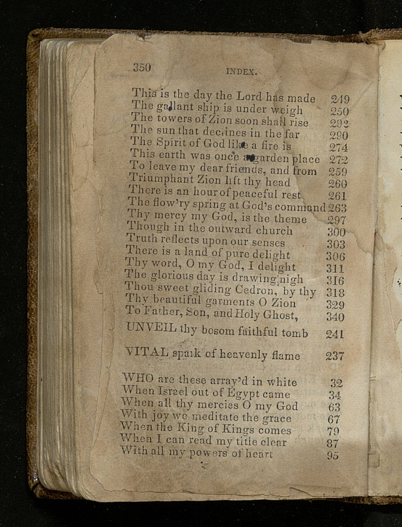 , comp., A Collection of Sacred Hymns for the Church of Jesus Christ of Latter Day Saints, Nauvoo, IL: E. Robinson, 1841, [i]–iv, 5–351. The copy used herein is held at CHL. Includes archival markings.