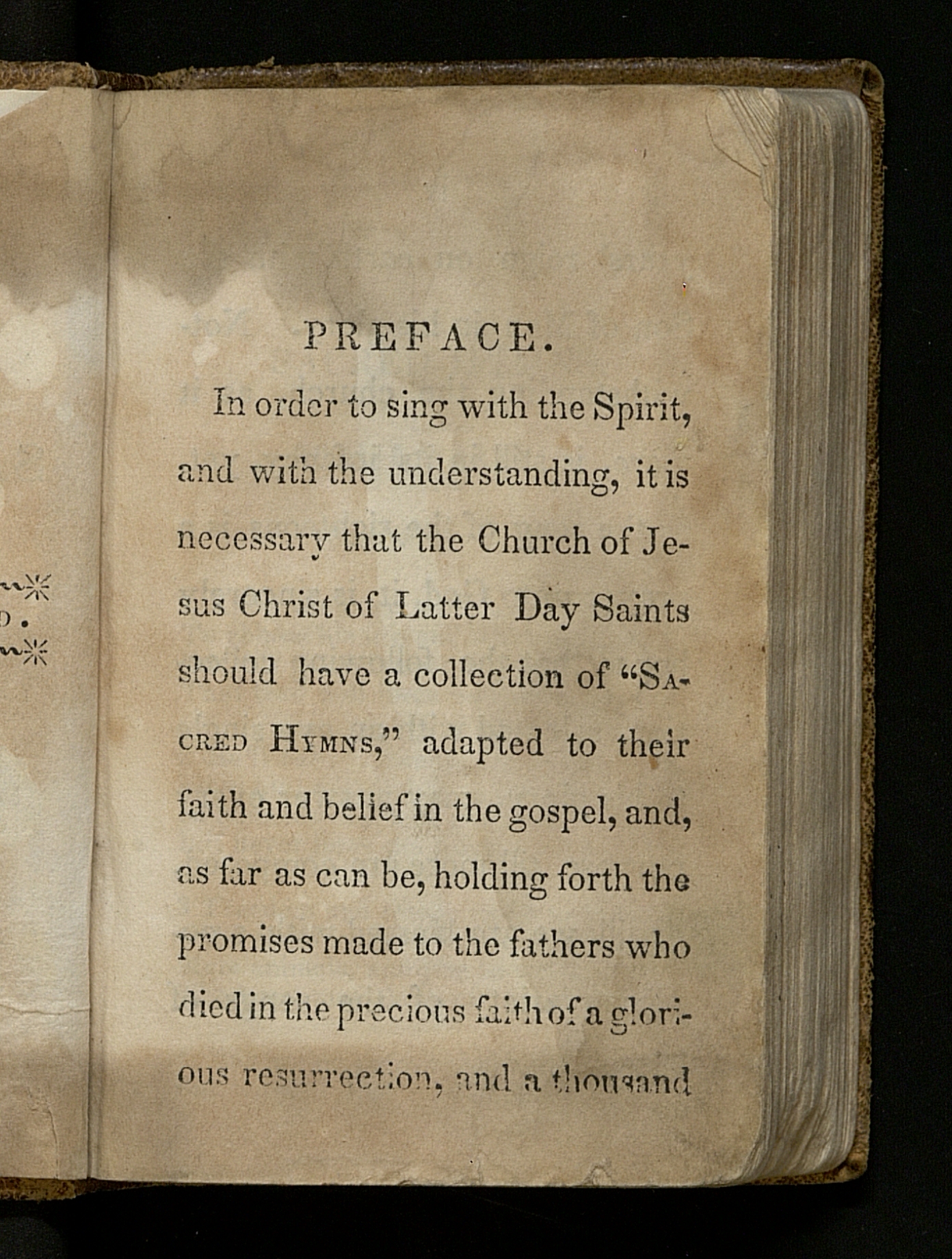 In order to sing with the Spirit, and with the understanding, it is necessary that the should have a collection of “Sacred Hymns,” adapted to their faith and belief in the gospel, and, as far as can be, holding forth the promises made to the fathers who died in the precious faith of a glorious resurrection, and a thousand [p. [iii]]