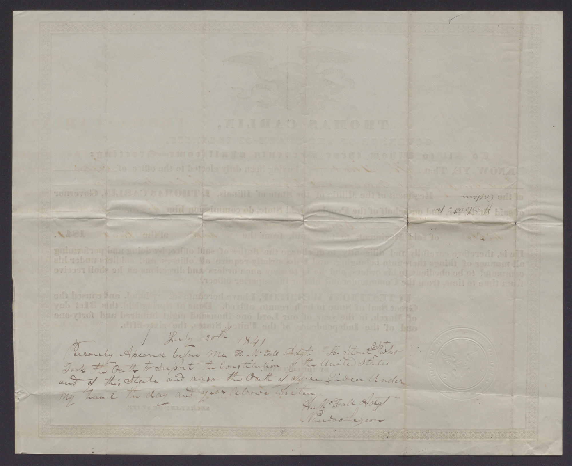 , Commission, , Sangamon Co., IL, to , , Hancock Co., IL, 31 Mar. 1841; printed form with manuscript additions probably in handwriting of ; signature of ; docket in handwriting of ; notation in handwriting of ; one page; Hosea Stout, Papers, CHL. Includes seal.