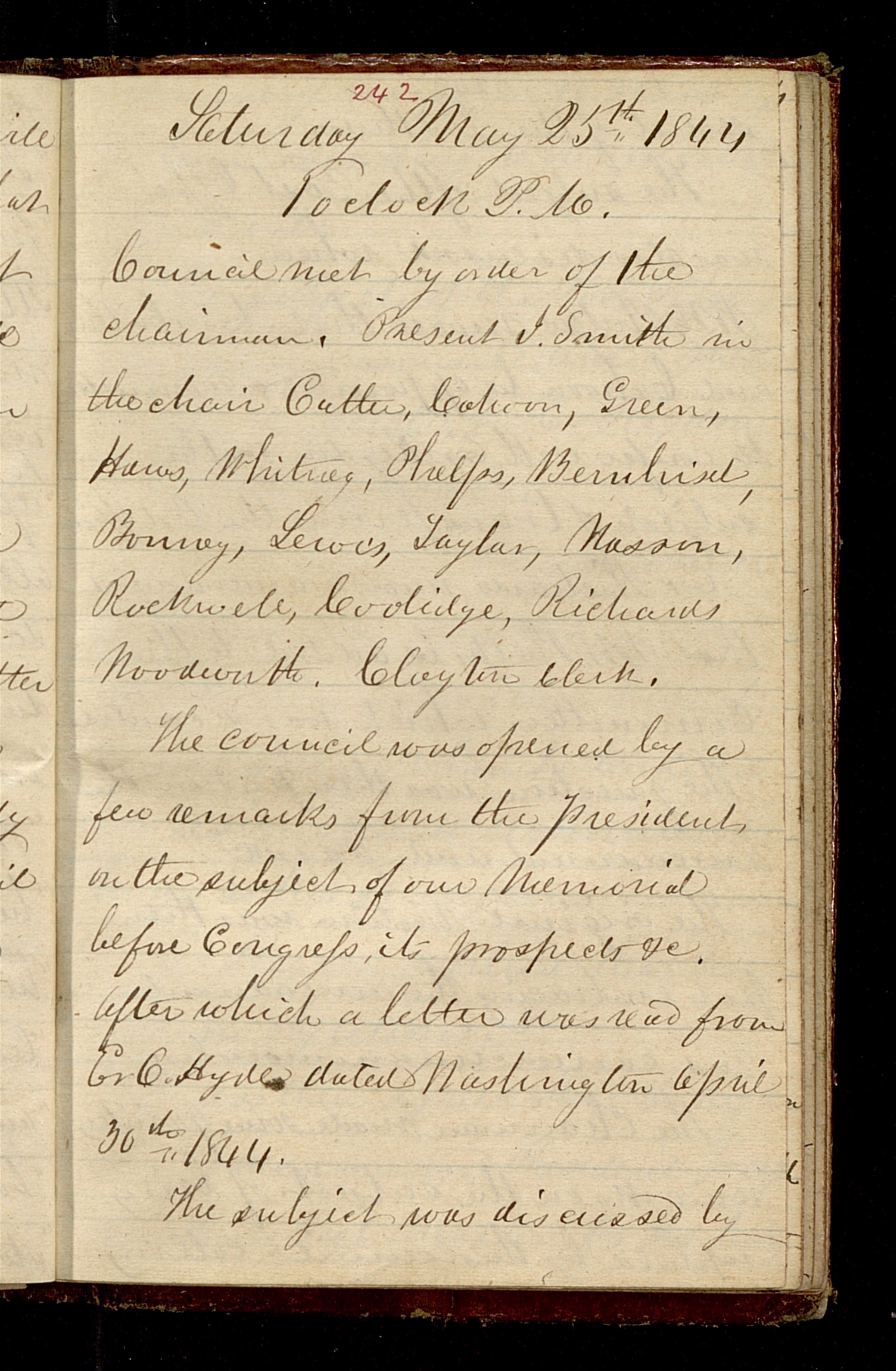 JS’s journal reports that the council met at “2. P.M.” The journal entry notes an event that occurred “towa[r]ds night” before it notes the afternoon council meeting, indicating that the note regarding the council meeting was written that night or later. In contrast, the minutes are apparently contemporaneous, suggesting that the meeting likely began at 1:00 p.m. (JS, Journal, 25 May 1844.)