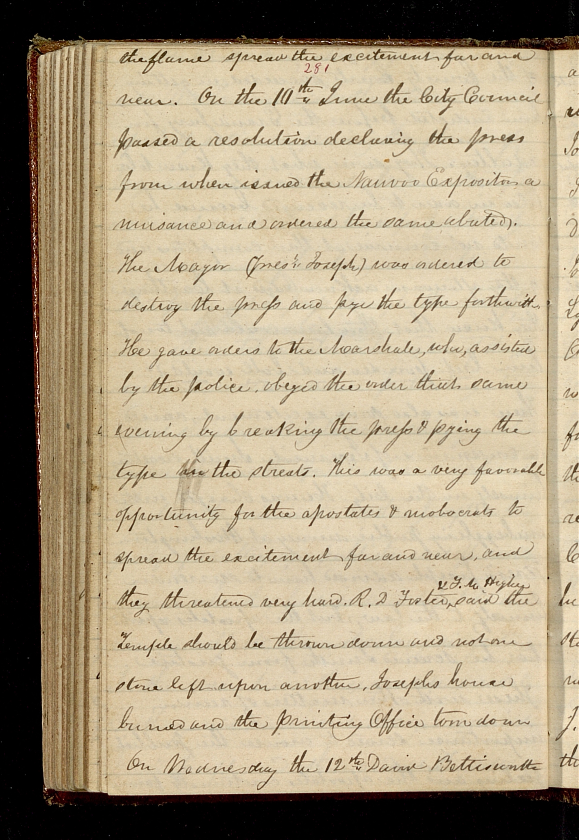 JS also heard a report that Francis Higbee had stated, speaking of the Expositor’s printing press, “If th[e]y lay their hand up[o]n it. or break it. th[e]y may date their downfall f[r]om that ve[r]y hour. and in 10 days there will not be a Mormon left in Nauvoo.” (JS, Journal, 11 June 1844.)