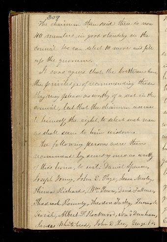 This count of forty members includes the recorder, Willard Richards, and the clerk, William Clayton. In the JS era of the council, JS declared the council full when it first reached fifty members excluding Richards and Clayton. (Council of Fifty, “Record,” 18 Apr. 1844; Clayton, Journal, 18 Apr. 1844.)