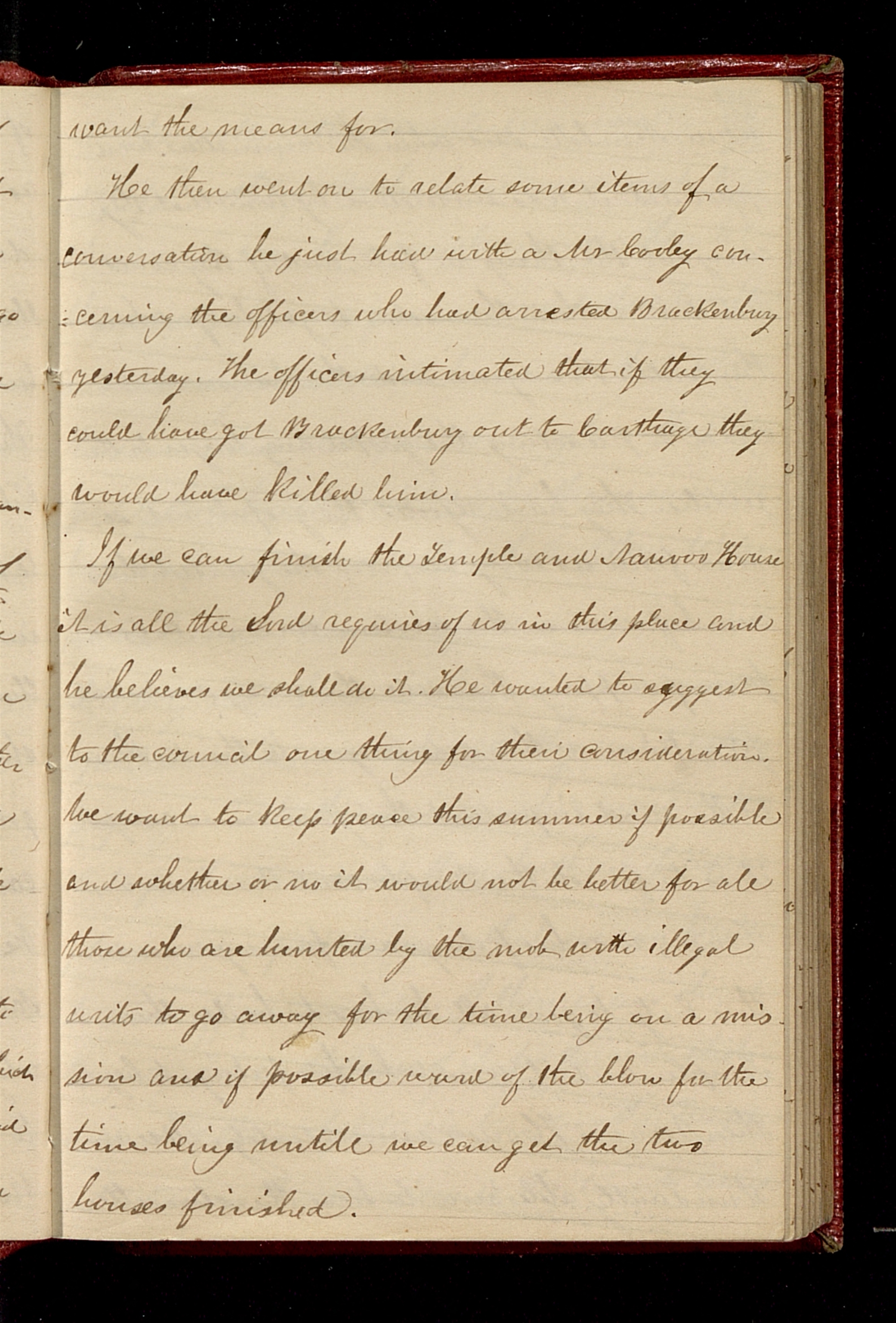 On 8 March 1845 a justice of the peace in Augusta, Illinois, issued an arrest warrant for Brackenbury, a witness in the trial of the accused murderers of JS and Hyrum Smith, after citizens in southern Hancock County accused him of committing perjury before the grand jury the previous fall. Two days later Brackenbury was arrested at the Nauvoo Mansion. Fearing for his safety, a group of Latter-day Saints distracted the four officers guarding him while Oliver B. Huntington “sliped Brackenbery out, and into a back room— through another back door, and so he dissappeared entirely.” Brigham Young arranged for an armed guard to escort Brackenbury to his trial in Augusta on 13 March. After the prosecution stated that it was not prepared for the trial, the case was continued to 19 March and Brackenbury’s party returned to Nauvoo. Legal wrangling continued throughout the month, but in May a grand jury refused to indict him; his case was formally dismissed that fall. (Docket, 12 May 1845, State of Illinois v. Brackenbury [J.P. Ct. 1845], microfilm, Hancock Co., IL, Circuit Court, Cases Files, 1830–1847, CHL; Huntington, History, 100; Clayton, Journal, 10 Mar. 1845; Stout, Journal, 13 Mar. 1845; Taylor, Journal, [Mar. 1845], 44–46; Oaks and Hill, Carthage Conspiracy, 68–69, 81; Recognizance, 21 Oct. 1845, State of Illinois v. Brackenbury [J.P. Ct. 1845], microfilm, Hancock Co., IL, Circuit Court, Cases Files, 1830–1847, CHL.)