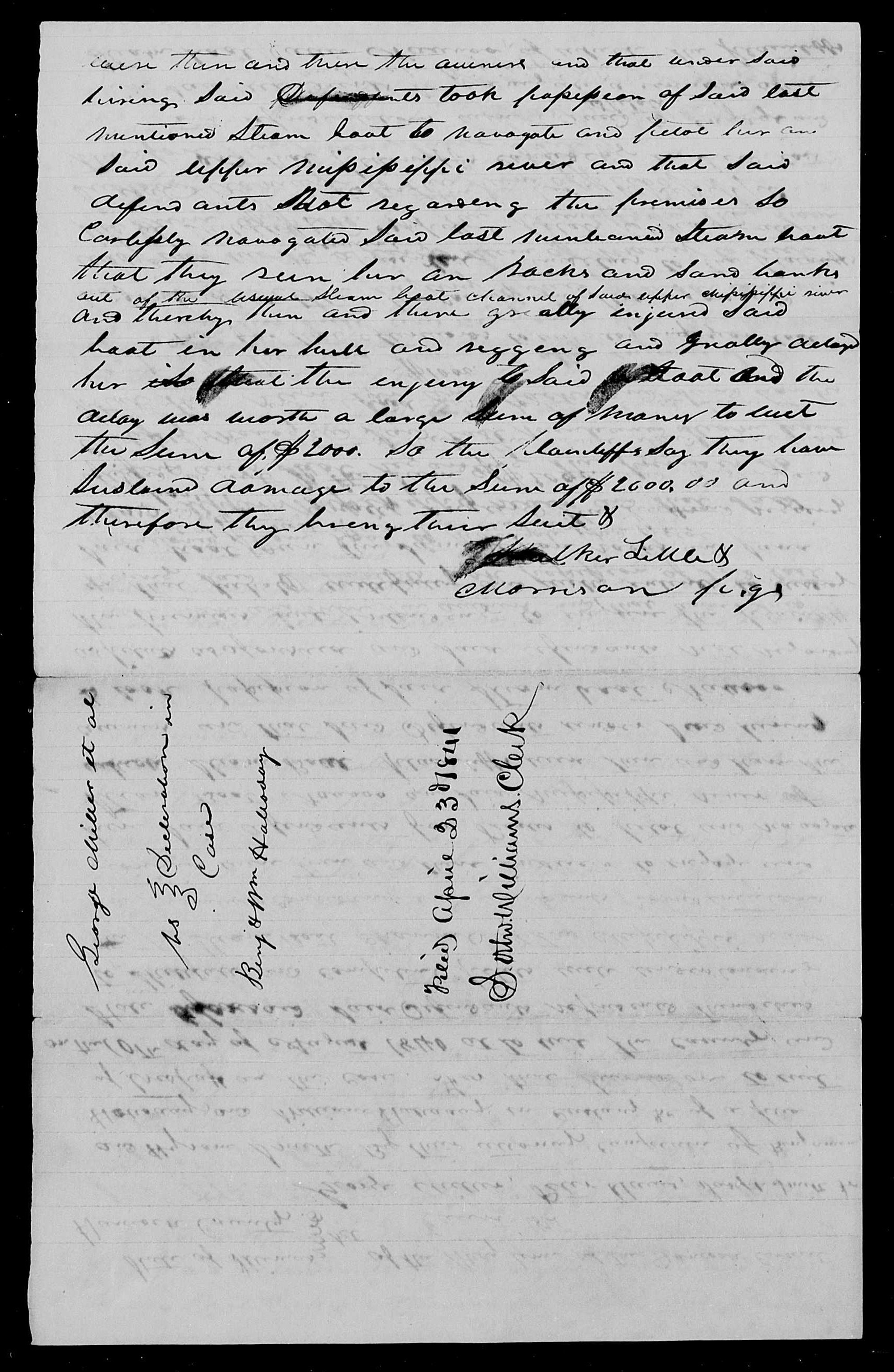 were then and there the owners and that under Said hiring Said plaintiffs Defendants took possession of Said last mentioned Steam boat to navagate and pilot her on Said Upper and that Said defendants Said <not> regarding the premises so Carlessly navagated Said last Mentioned Steam boat that they run her on rocks and Sand banks <out of the usual Steam boat channel of Said upper > and thereby then and there greatly injured Said boat in her hull and rigging and greatly delayed her in So that the injury to Said boat and the delay was worth a large Sum of Money to wit the Sum of $2000. So the plaintiffs Say they have Sustained damage to the Sum of $2000.00 and therefore they bring their Suit &