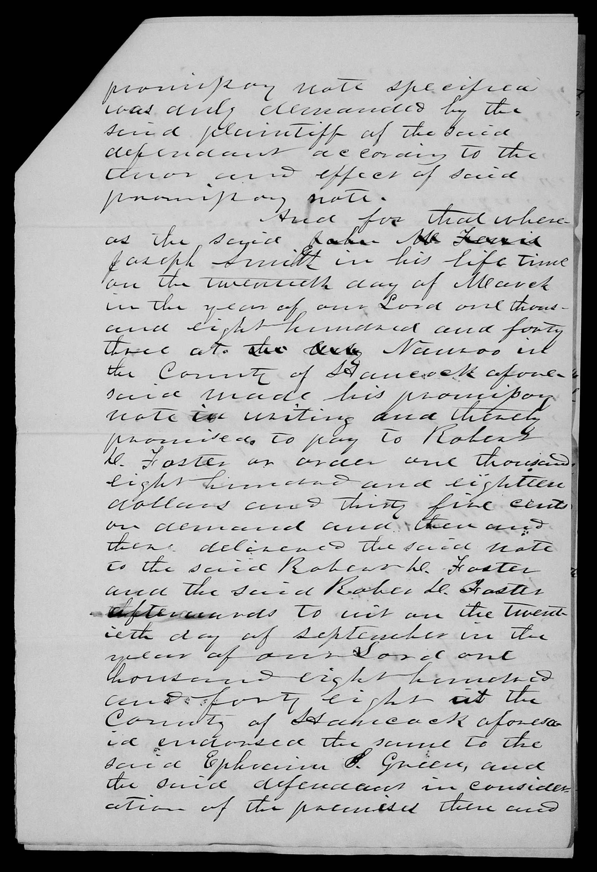 And for that whereas the said Joseph Smith in his life time on the twentieth day of March in the year of our Lord one thousand eight hundred and forty three at the City in the County of aforesaid made his promissory note in writing and thereby promised to pay to on order one thousand eight hundred and eighteen dollars and thirty five cents on demand and then and there delivered the said note to the said and the said afterwards to wit on the twentieth day of September in the year of our Lord one thousand eight hundred and forty eight in <at> the County of aforesaid endorsed the same to the said , and the said in consideration of the premises then and [p. [5]]