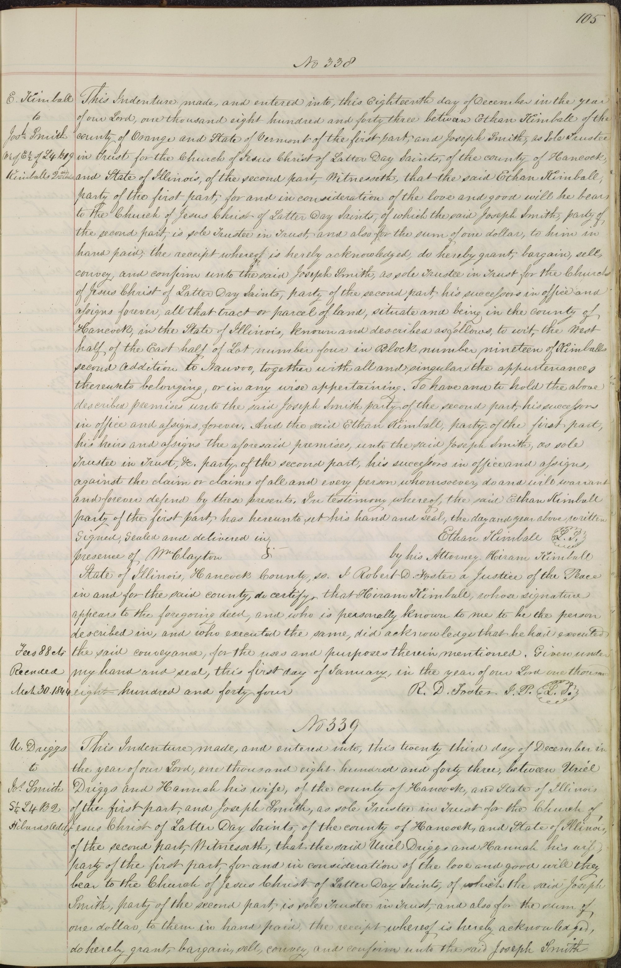 Ethan Kimball, Deed for property in , Hancock Co., IL, to JS as trustee-in-trust for the Church of Jesus Christ of Latter-day Saints, 18 Dec. 1843; sealed by on behalf of Ethan Kimball; witnessed by ; certified by , 1 Jan. 1844. Version copied 30 Mar. 1844 in Nauvoo Registry of Deeds, Record of Deeds, bk. B, p. 105; unidentified handwriting; CHL.