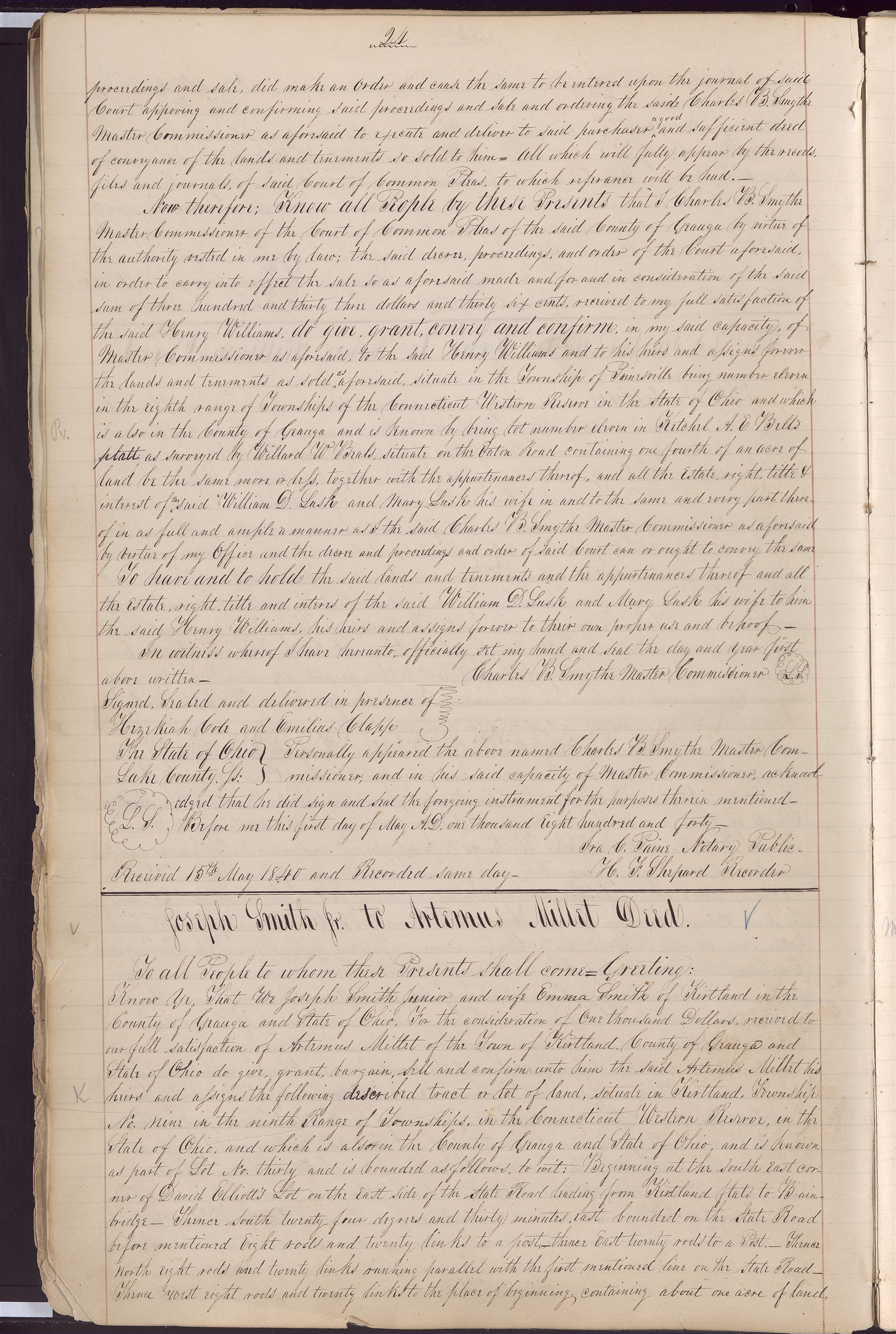 Know ye That we Joseph Smith Junior and wife of in the County of Geauga and State of Ohio, For the consideration of one thousand Dollars, received to our full satisfaction of of the Town of , County of Geauga and State of Ohio do give, grant, bargain, Sell and confirm unto him the said his heirs and assigns the following described tract or lot of land, situate in , Township No. nine in the ninth Range of Townships, in the , in the State of , and which is also in the County of and State of , and is known as part of Lot No. thirty and is bounded as follows to wit: Beginning at the South East corner of 's Lot on the East Side of the State Road leading from to Bainbridge— Thence South twenty four degrees and thirty minutes east bounded on the State Road before mentioned Eight rods and twenty links to a post,— thence East twenty rods to a Post.— Thence north eight rods and twenty links running parallel with the first mentioned line on the State Road— Thence west eight rods and twenty links to the place of beginning containing about one acre of land. [p. 24]