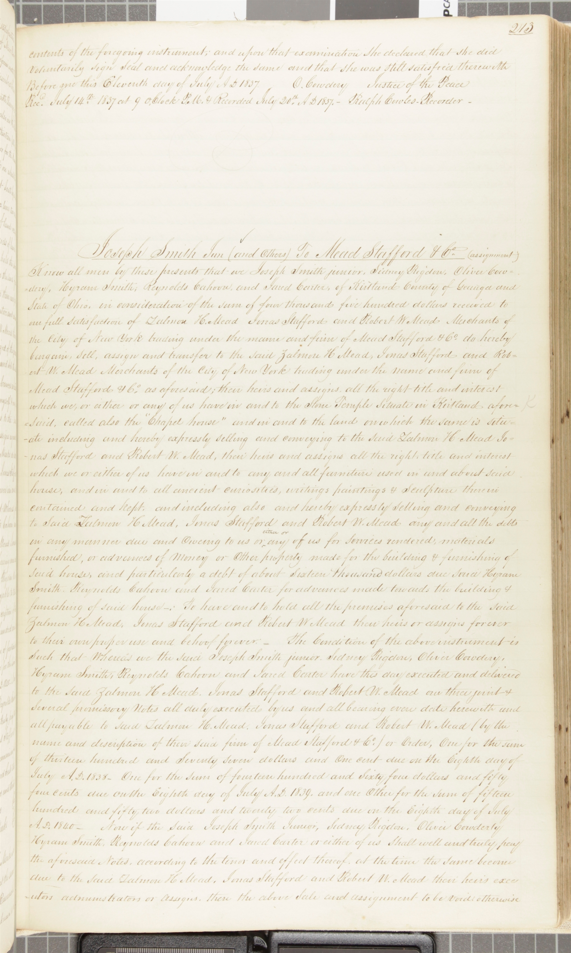 and Rosannah Robinson Marks, Deed for property in , Geauga Co., OH, to Zalmon H. Mead, Robert Mead, and Jonas Stafford of Mead, Stafford & Co., 11 July 1837; signed by and Rosannah Robinson Marks; witnessed by and ; certified by . Featured version copied 20 July 1837 in Geauga County Deed Record, vol. 24, pp. 211–213; handwriting of ; Geauga County Archives and Records Center, Chardon, OH.