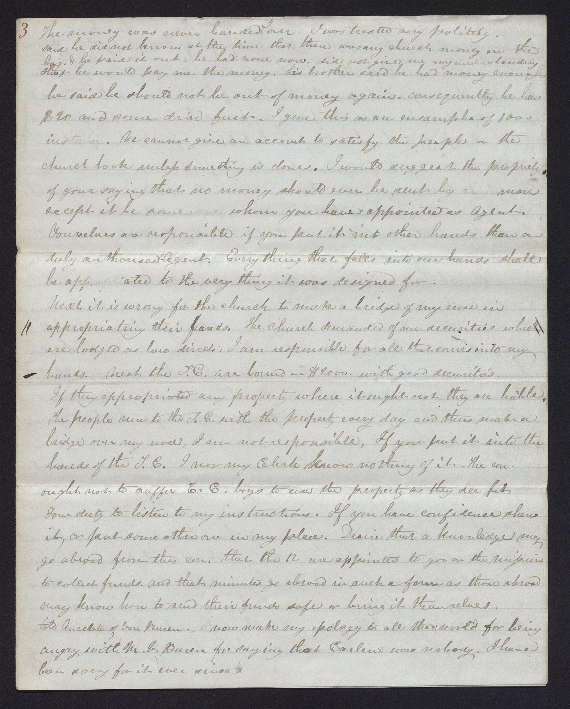 Next it is wrong for the church to make a bridge of my nose in appropriating their hands funds. The church demanded of me securities which are lodged as law directs. I am responsible for all that comes into my hands. Next the are bound in $2000. with good securities. If they appropriated any property where it ought not they are liable. The people run to the T. C. with the property every day and thus make a bridge over my nose, I am not responsible, If you put it into the hands of the T. C. I nor my know nothing of it The ought not to suffer boys to use the property as they see fit. Your duty to listen to my instructions. If you have confidence shew it, or put some other one in my place. Desire that a knowledge may go abroad from this con that the are appointed to goe on the mission to collect funds. and that minutes go abroad in such a form as those abroad may know how to send their funds safe or bring it themselves. [p. [3]]