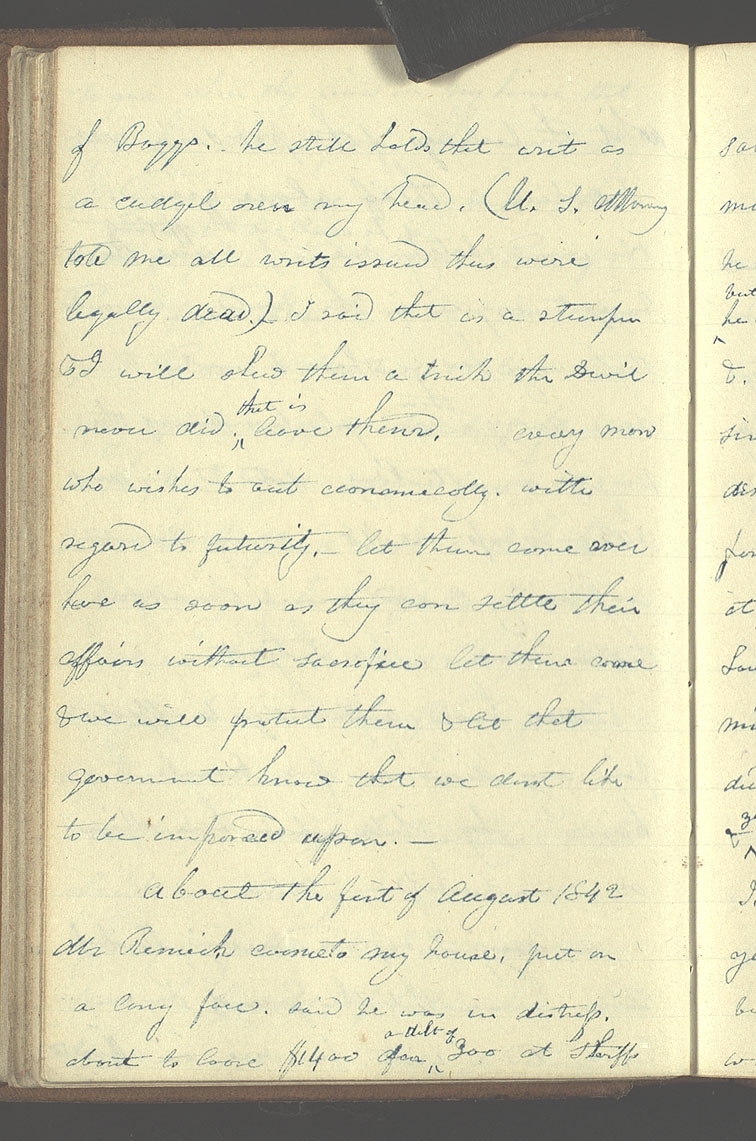 of .— he still holds that writ as a cudgel over my head. ( told me all writs issued thus were legally dead.)— I said that is a stumper & I will shew them a trick the Devil never did. <that is> leave them. every man who wishes to out economically. with regard to futurity.— let them come over here as soon as they can settle their affairs without sacrifice let them come & we will protect them & let that governme[n]t know that we don’t like to be imposed upon.—