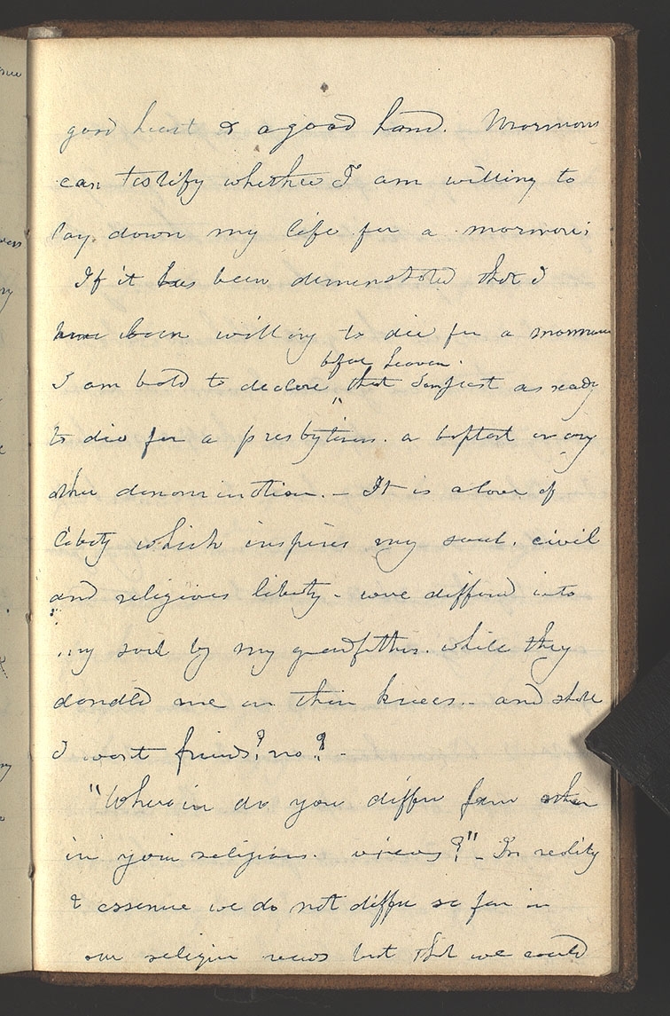 JS’s comments regarding his willingness to die to defend the religious liberty of adherents to other denominations paralleled a statement he made in a March 1839 letter, which was written while he was imprisoned in Clay County, Missouri. The sentiment reflected shifting cultural attitudes regarding religious pluralism in the United States. Previously, many Catholics and Protestants assumed that religious homogeneity was essential for a healthy society. Governments privileged established churches and persecuted dissidents. Religious violence in Europe, combined with growing religious diversity in the American colonies, led to legal and cultural changes in the early American republic that resulted in religious liberty, first for various white Protestant denominations and then gradually for Catholicism and other marginal faiths. JS’s grandfathers, Asael Smith and Solomon Mack, came of age during this cultural shift and inculcated these beliefs in their descendants. (See Letter to Edward Partridge and the Church, ca. 22 Mar. 1839; Beneke, Beyond Toleration, 6–10; and Anderson, Joseph Smith’s New England Heritage, chaps. 2–5.)