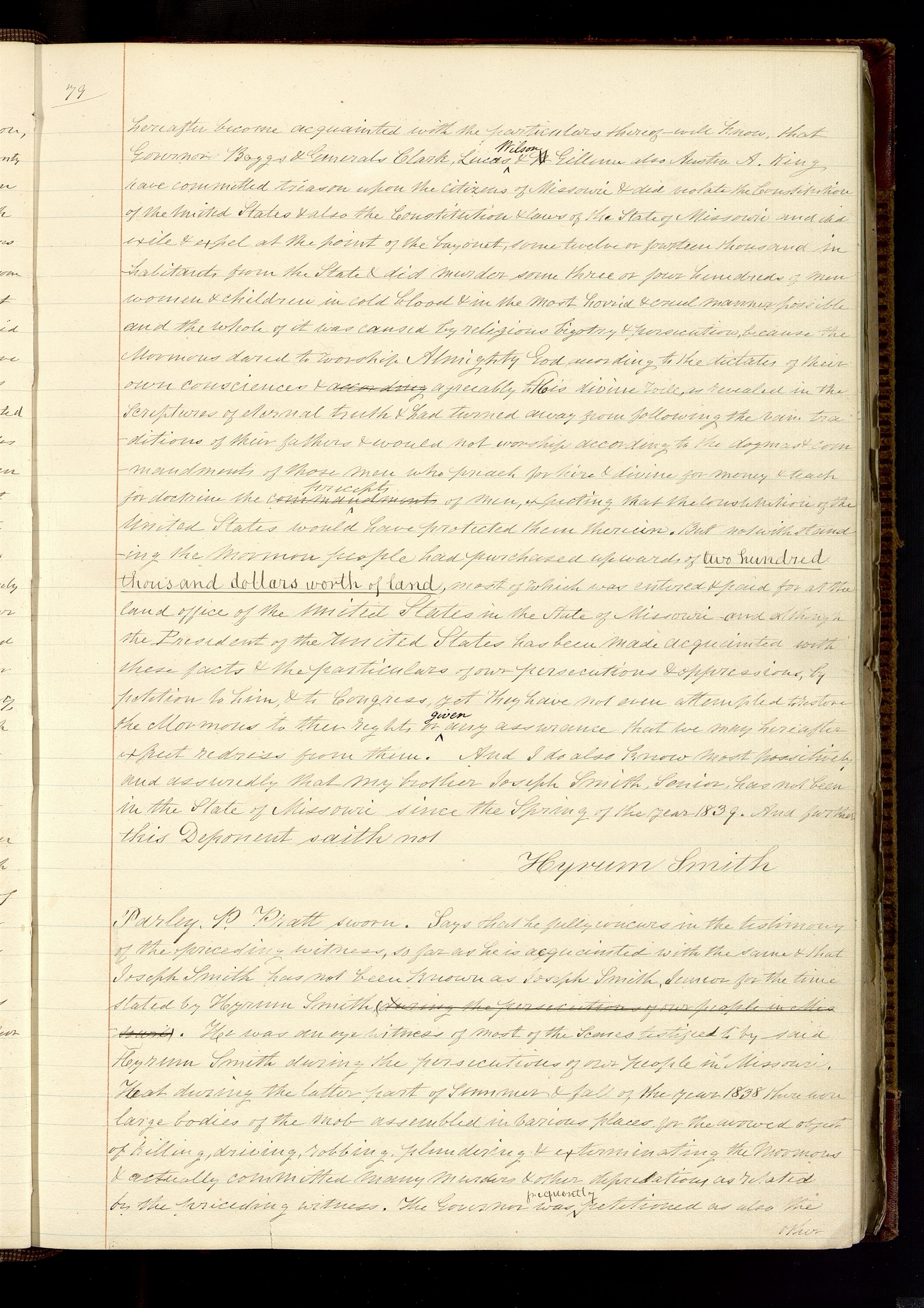 hereafter become acquainted with the particulars thereof— will know, that & Generals , & W also have committed treason upon the citizens of & did violate the Constitution of the & also the Constitution & laws of the State of and did exile & expel at the point of the bayonet, some twelve or fourteen thousand inhabitants from the & did murder some three or four hundreds of men women & children in cold blood & in the most horrid & cruel manner possible and the whole of it was caused by religious bigotry & persecution, because the Mormons dared to worship Almighty God according to the dictates of their own consciences & according agreeably to His divine will, as revealed in the Scriptures of eternal truth & had turned away from following the vain traditions of their fathers & would not worship according to the dogmas & commandments of those men who preach for hire & divine for money & teach for doctrine the commandments <precepts> of men, expecting that the constitution of the would have protected them thereein. But notwithstanding the mormon people had purchased upwards of two hundred thousand dollars worth of land, most of which was entered & paid for at the land office of the in the State of and although the of the has been made acquainted with these facts & the particulars of our persecutions & oppressions, by petition to him, & to Congress, yet they have not even attempted to restore the Mormons to their rights or any assurance that we may hereafter expect redress from them. And I do also know most possitively and assuredly that my brother Joseph Smith, Senior, has not been in the State of since the Spring of the year 1839. And further this saith not