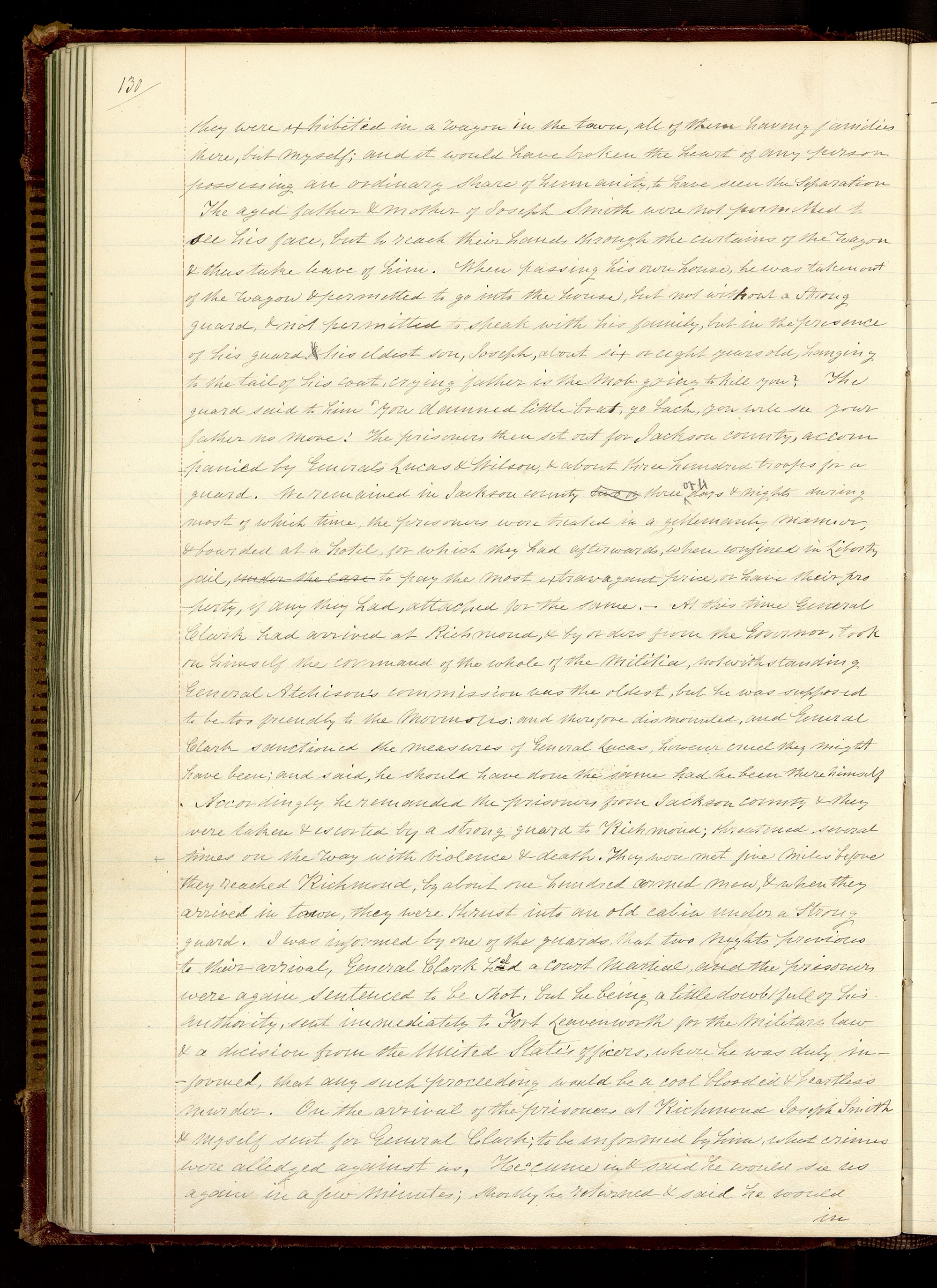 The aged & of Joseph Smith were not permitted to see his face, but to reach their hands through the curtains of the wagon & thus take leave of him. When passing his own house, he was taken out of the wagon & permitted to go into the house, but not without a strong guard, & not permitted to speak with his family, but in the presence of his guard. & his eldest son, , about six or eight years old, hanging to the tail of his coat, crying father is the mob going to kill you? The guard said to him ‘you damned little brat, go back, you will see your father no more.’ The prisoners then set out for , accompanied by Generals & , & about three hundred troops for a guard. We remained in two or three days & nights during most of which time, the prisoners were treated in a ge[n]tlemanly manner, & boarded at a hotel, for which they had afterwards, when confined in , under the care to pay the most extravagant price, or have their property, if any they had, attached for the same.— At this time had arrived at , & by orders from the , took on himself the command of the whole of the militia, notwithstanding ’s commission was the oldest, but he was supposed to be too friendly to the mormons: and therefore dismounted, and sanctioned the measures of , however cruel they might have been; and said, he should have done the same had he been there himself . Accordingly he remanded the prisoners from & they were taken & escorted by a strong guard to ; threatened several times on the way with violence & death. They were met five miles before they reached , by about one hundred armed men, & when they arrived in town, they were thrust into an old cabin under a strong guard. I was informed by one of the guards, that two nights previous to their arrival, had a court martial, and the prisoners were again sentenced to be shot, but he being a little doubtfull of his authority, sent immediately to Fort Leavenworth for the military law & a decision from the ’s officers, where he was duly informed, that any such proceeding would be a cool blooded & heartless murder. On the arrival of the prisoners at Joseph Smith & myself sent for ; to be informed by him, what crimes were alledged against us, He came in & said he would see us again in a few minutes; shortly he returned & said he would in [p. 130]