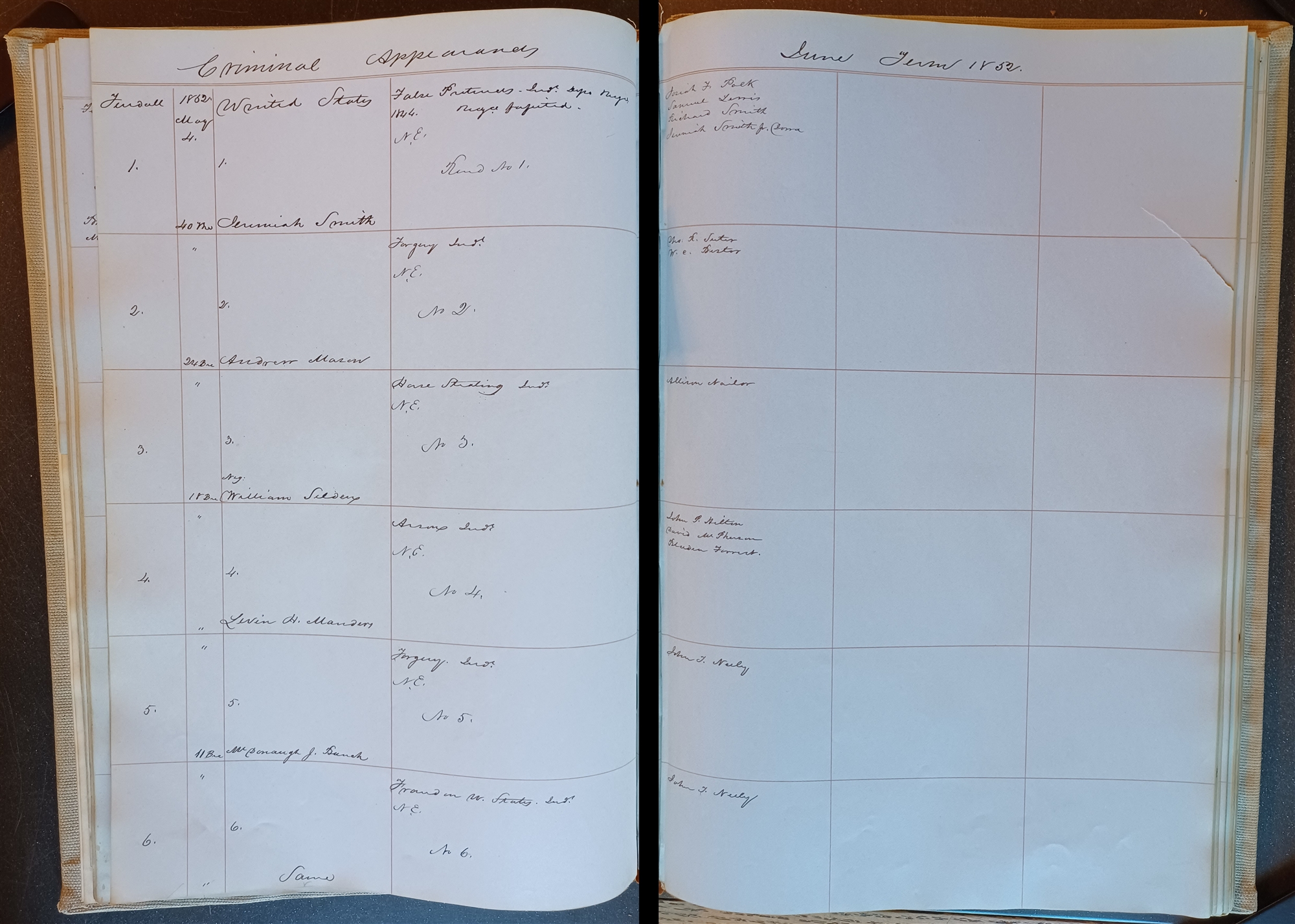 | Fendall [Philip Richard Fendall II] | 1852, May 4. | False Pretences— Depo[sition] 1844. Recgce. forfeited— N. E. [non est] Rend No 1. | Josiah F. Polk Samuel Lewis Richard Smith Jeremiah Smith Jr. ( | |