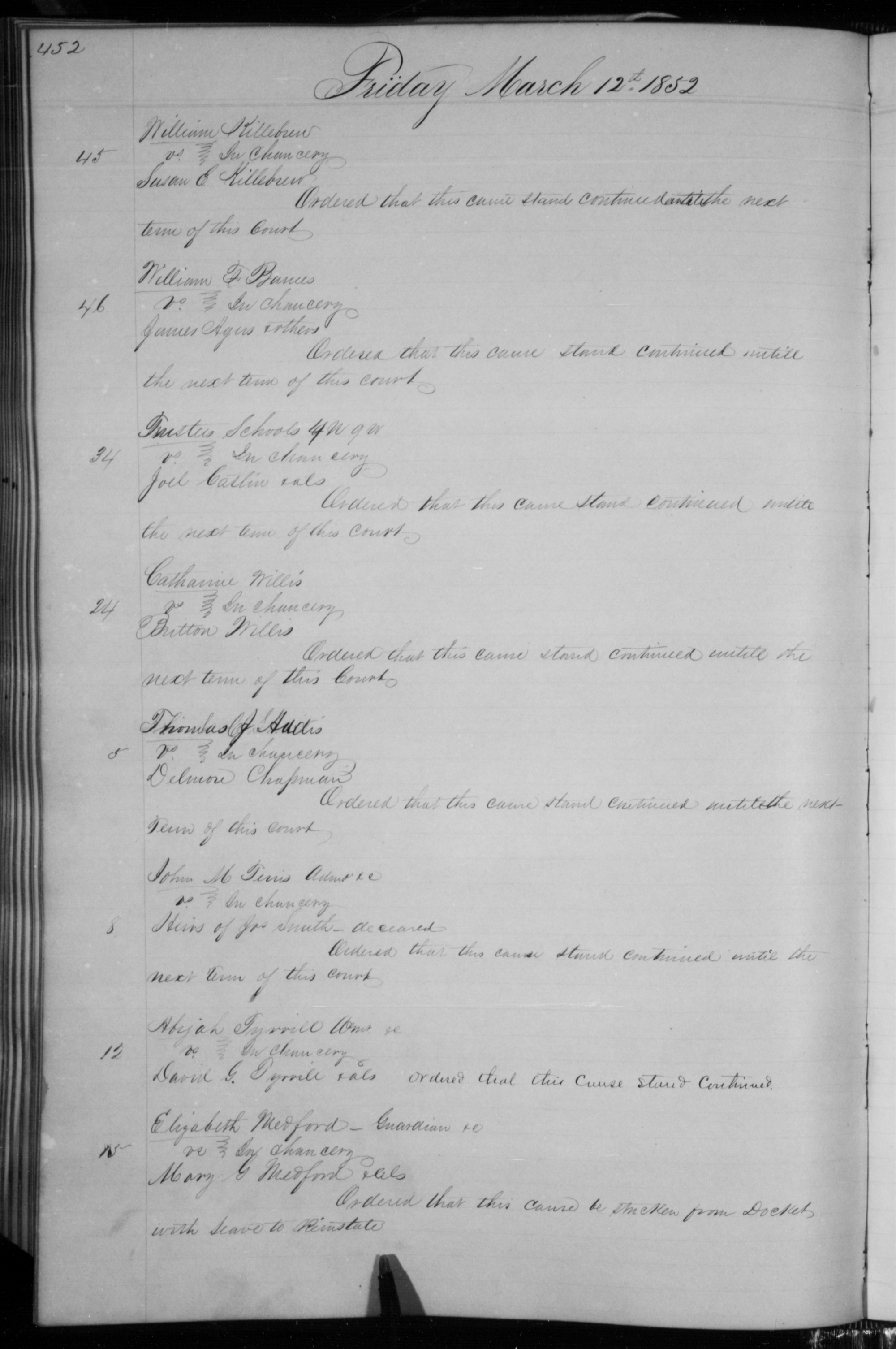 Docket Entry, Continuance, 12 March 1852 [Ferris Administrator of the Estate of JS v. Heirs of JS]
