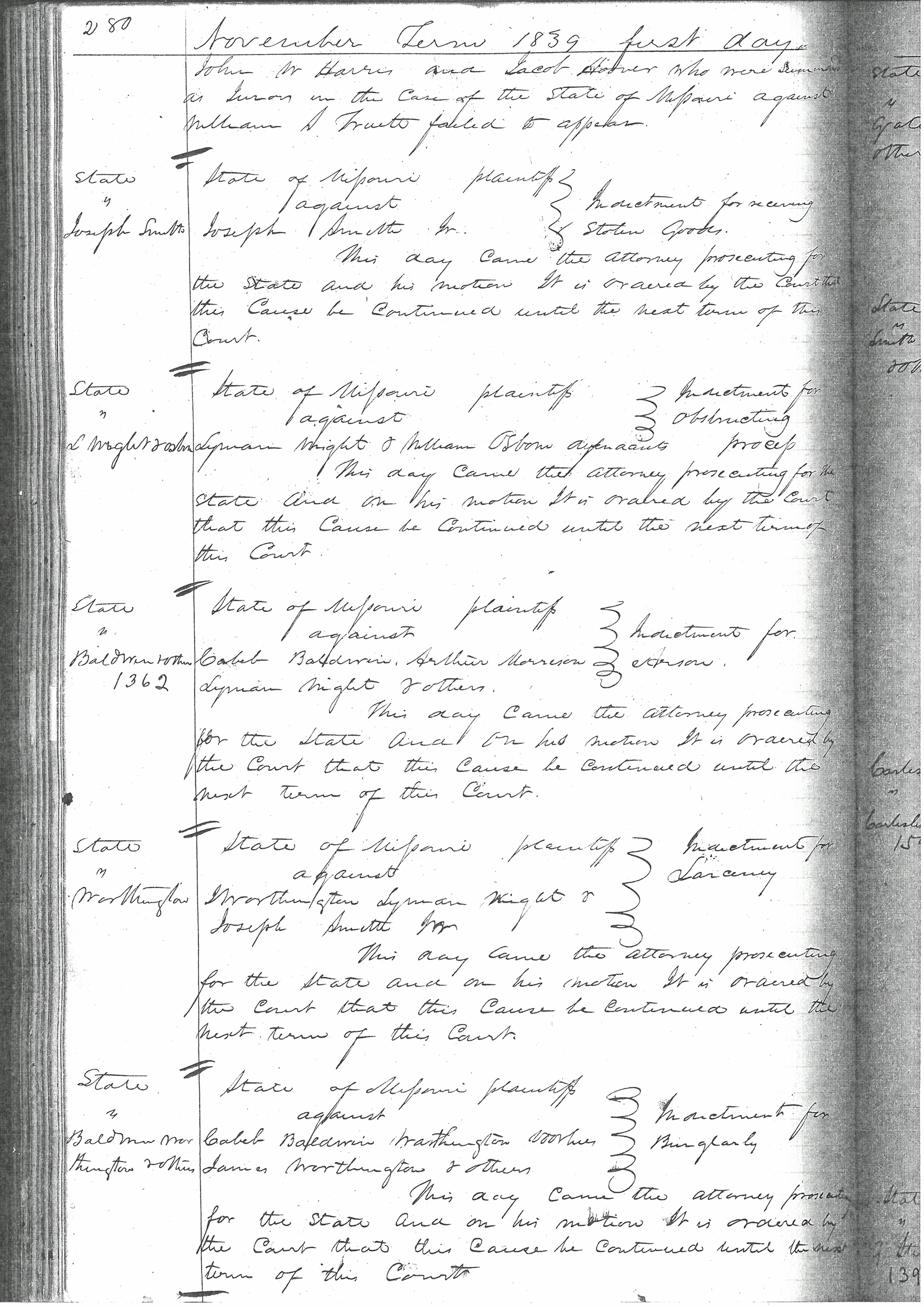 Docket Entry, Continuance, [Columbia, Boone Co., MO, 4 Nov. 1839], State of MO v. Worthington et al. for Larceny (Boone Co., MO, Circuit Court 1840); Boone County Circuit Court Record, vol. C, p. 280; handwriting of ; Boone County Courthouse, Columbia, MO. Photocopy at BYU.
