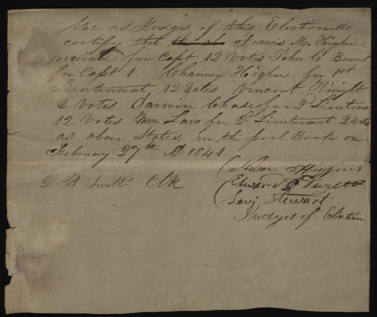 We as Judges of this Election do certify that the abo received for Capt 12 votes for Capt 1 for 1st Lieutenant 12 votes 2 votes for 2d Lieutena[nt] 12 votes for 2d Lieutenant 2 votes as above Stated in the pool [poll] Book on February 27th AD 1841