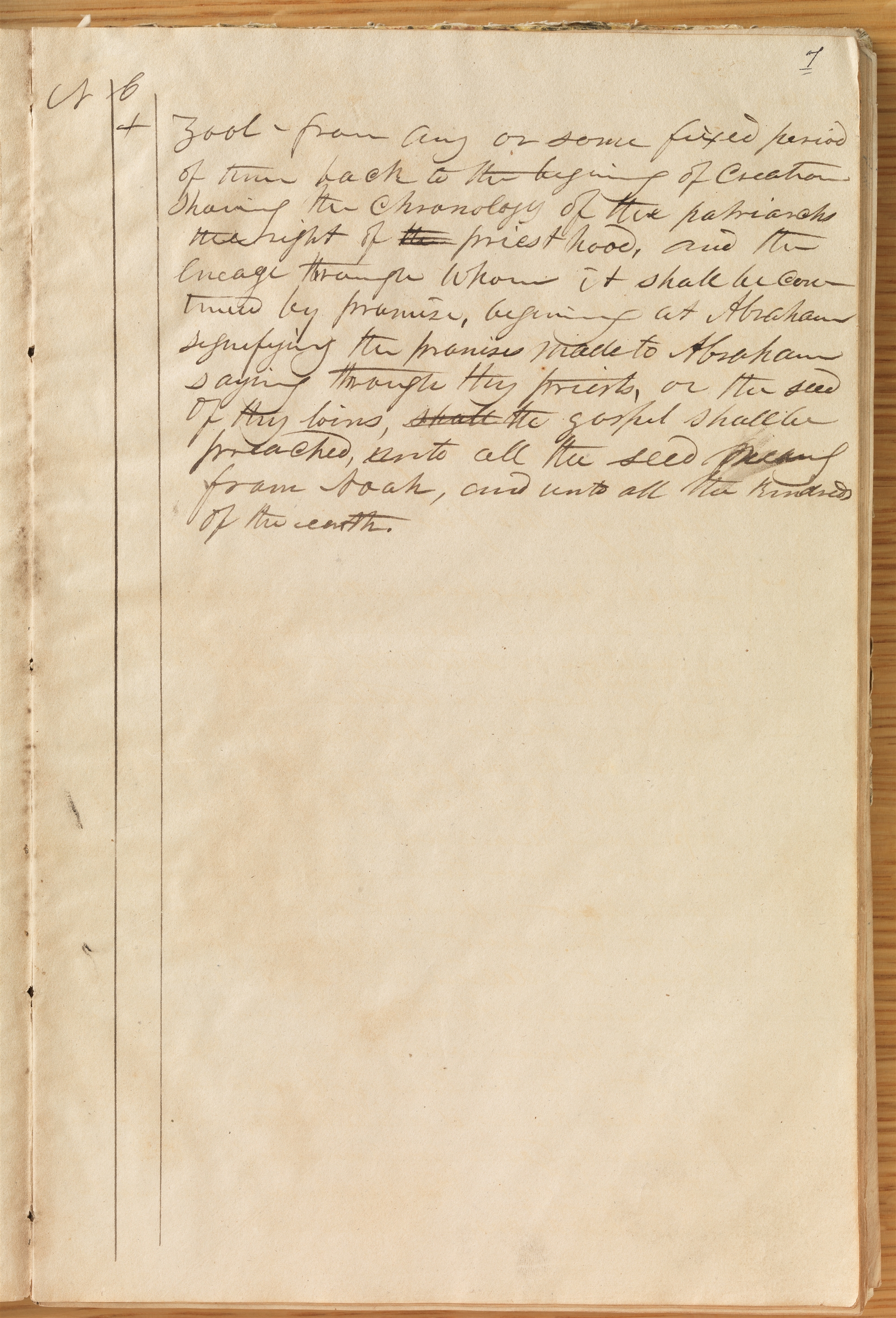 | ✦ [1.23] | Zool— from any or some fixed period of time back to the beginning of creation showing the chronology of the patriarchs the right of the priesthood, and the l[i]neage through whom it shall be continu[e]d by promise, begining at Abraham signifying the promises made to Abraham saying through thy priests, or the seed of thy loins, shall the gospel shall be preached, unto all the seed meaning from Noah, and unto all the kindreds of the earth. |