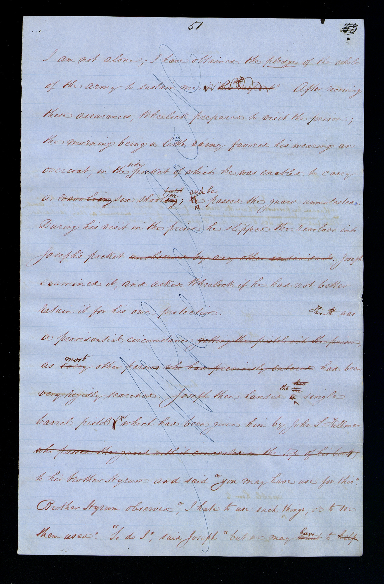 I am not alone; I have obtained the pledge of the whole of the army to sustain me in this respect <it>.” After receiving these assurances, prepared to visit the prison; the morning being a little rainy favored his wearing an overcoat, in the <side> pocket of which he was enabled to carry a revolver <revolving> six shooting <shooter> <pistol>; he <and he> passed the guard unmolested. During his visit in the prison he slipped the revolver into Joseph’s pocket unobserved by any other individual. Joseph examined it, and asked if he had not better retain it for his own protection. [blank] <This> It was a providential circumstance getting the pistol into the prison, as every <most> other persons who had previously entered had been very rigidly searched. Joseph then handed a <the> <his> <the> single barrel pistol (which had been given him by who passed the guard with it concealed in the top of his boot) to his brother and said “you may have use for this”. observed, “I hate to use such things, or to see them used.” “So do I”, said Joseph “but we may want <have> to help