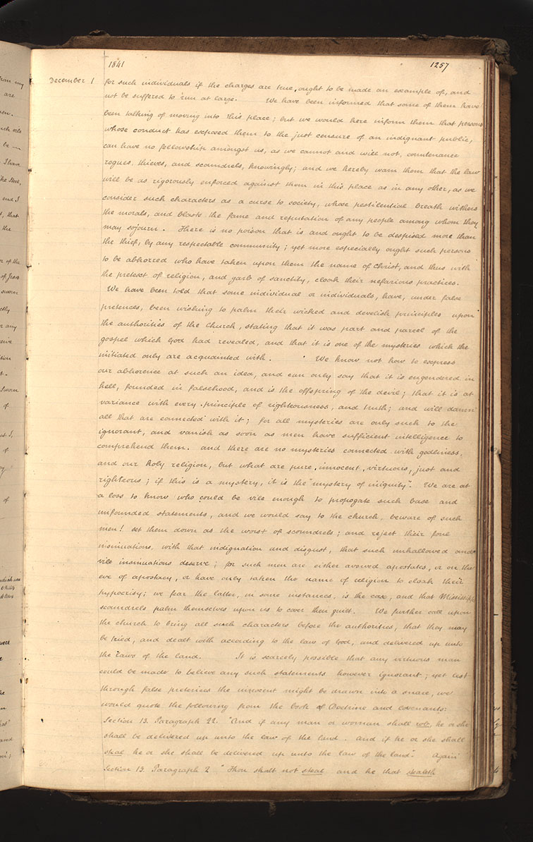 <December 1> for such individuals if the charges are true, ought to be made an example of, and not be suffered to run at large. We have been informed that some of them have been talking of moving into this place; but we would here inform them that persons whose conduct has exposed them to the just censure of an indignant public, can have no fellowship amongst us, as we cannot and will not, countenance rogues, thieves, and scoundrels, knowingly; and we hereby warn them that the law will be as rigorously enforced against them in [HC 4:463] this place as in any other, as we consider such characters as a curse to society, whose pestilential breath withers the morals, and blasts the fame and reputation of any people among whom they may sojourn. There is no poison that is and ought to be despised more than the thief, by any respectable community; yet more especially ought such persons to be abhorred who have taken upon them the name of Christ, and thus with the pretext of religion, and garb of sanctity, cloak their nefarious practices. We have been told that some individual or individuals, have, under false pretences, been wishing to palm their wicked and devilish principles upon the authorities of the Church, stating that it was part and parcel of the gospel which God had revealed, and that it is one of the mysteries which the initiated only are acquainted with. We know not how to express our abhorrence at such an idea, and can only say that it is engendered in hell, founded in falsehood, and is the offspring of the devil; that it is at variance with every principle of righteousness, and truth; and will damn all that are connected with it; for all mysteries are only such to the ignorant, and vanish as soon as men have sufficient intelligence to comprehend them. and there are no mysteries connected with godliness, and our holy religion, but what are pure, innocent, virtuous, just and righteous; if this is a mystery, it is the “mystery of iniquity.” We are at a loss to know who could be vile enough to propogate such base and unfounded statements, and we would say to the church, beware of such men! set them down as the worst of scoundrels; and reject their foul insinuations with that indignation and disgust, that such unhallowed and vile insinuations deserve; for such men are either avowed apostates, or on the eve of apostacy, or have only taken the name of religion to cloak their hypocrisy; we fear the latter, in some instances, is the case, and that scoundrels palm themselves upon us to cover their guilt. We fur[HC 4:464]ther call upon the church to bring all such characters before the authorities, that they may be tried, and dealt with according to the law of God, and delivered up unto the laws of the land. It is scarcely possible that any virtuous man could be made to believe any such statements however ignorant; yet lest through false pretences the innocent might be drawn into a snare, we would quote the following from the book of Doctrine and Covenants: Section 13. Paragraph 22. “And if any man or woman shall rob, he or she shall be delivered up unto the law of the land. And if he or she shall steal he or she shall be delivered up unto the law of the land.” Again Section 13. Paragraph 2 “Thou shalt not steal and he that stealeth [p. 1257]