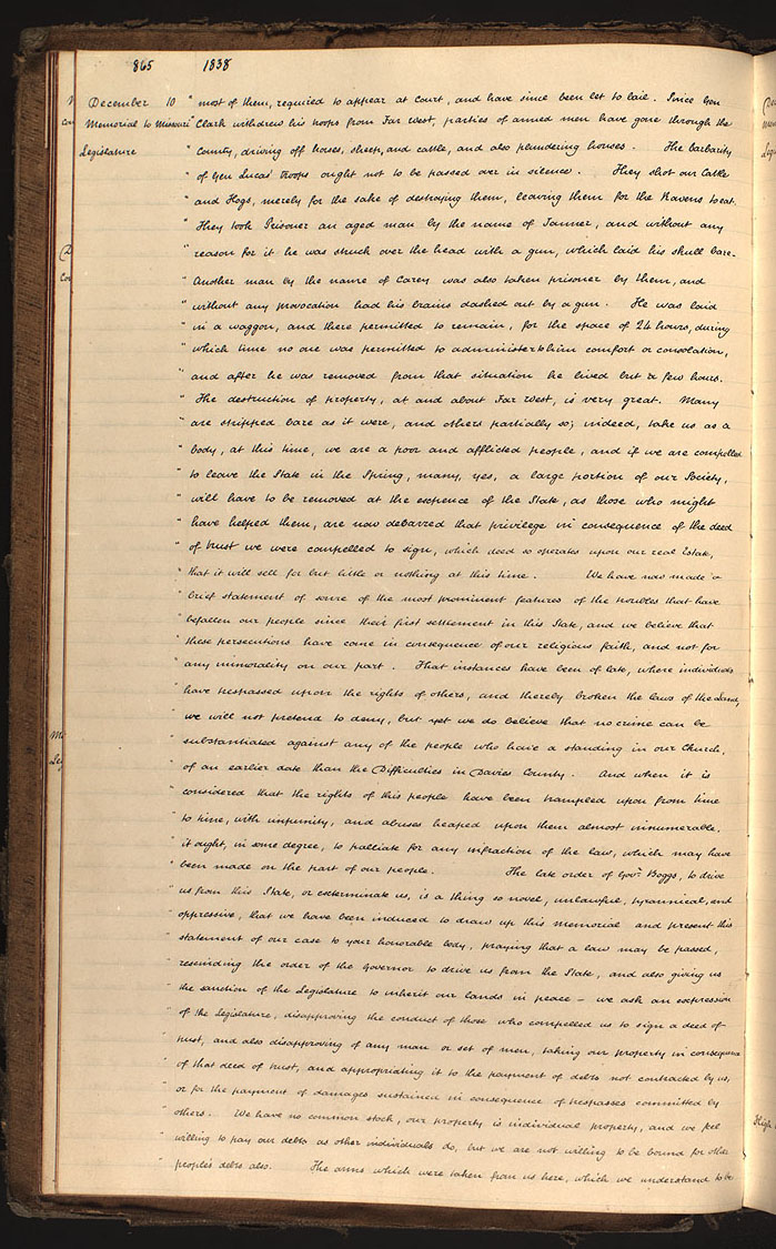 <December 10 Memorial to Legislature> most of them, required to appear at Court, and have since been let to bail. Since withdrew his troops from , parties of armed men have gone through the , driving off horses, sheep, and cattle, and also plundering houses. The barbarity of ’ troops ought not to be passed over in silence. They shot our Cattle and Hogs, merely for the sake of destroying them, leaving them for the Ravens to eat. They took Prisoner an aged man by the name of , and without any reason for it he was struck over the head with a gun, which laid his skull bare— Another man by the name of [William] Carey was also taken prisoner by them, and without any provocation had his brains dashed out by a gun. He was laid in a waggon, and there permitted to remain, for the space of 24 hours, during which time no one was permitted to administer to him comfort or consolation, and after he was removed from that situation he lived but a few hours. The destruction of property, at and about , is very great. Many are stripped bare as it were, and others partially so; indeed, take us as a body, at this time, we are a poor and afflicted people, and if we are compelled to leave the in the Spring, many, yes, a large portion of our Society, will have to be removed at the expence of the , as those who might have helped them, are now debarred that privilege in consequence of the deed of trust we were compelled to sign, which deed so operates upon our real Estate, that it will sell for but little or nothing at this time. We have now made a brief statement of some of the most prominent features of the troubles that have befallen our people since their first settlement in this , and we believe that these persecutions have come in consequence of our religious faith, and not for any immorality on our part. That instances have been of late, where individuals have trespassed upon the rights of others, and thereby broken the laws of the Land, we will not pretend to deny, but yet we do believe that no crime can be substantiated against any of the people who have a standing in our Church, of an earlier date than the Difficulties in . And when it is considered that the rights of this people have been trampled upon from time to time, with impunity, and abuses heaped upon them almost innumerable, it ought, in some degree, to palliate for any infraction of the law, which may have been made on the part of our people. The late order of , to drive us from this , or exter[HC 3:222]minate us, is a thing so novel, unlawful, tyrannical, and oppressive, that we have been induced to draw up this Memorial and present this statement of our case to your honorable body, praying that a law may be passed, rescinding the order of the to drive us from the , and also giving us the sanction of the Legislature to inherit our lands in peace— we ask an expression of the Legislature, disapproving the conduct of those who compelled us to sign a deed of trust, and also disapproving of any man or set of men, taking our property in consequence of that deed of trust, and appropriating it to the payment of debts not contracted by us, or for the payment of damages sustained in consequence of trespasses committed by others. We have no common stock, our property is individual property, and we feel willing to pay our debts as other individuals do, but we are not willing to be bound for other people’s debts also. The arms which were taken from us here, which we understand to be [p. 865]