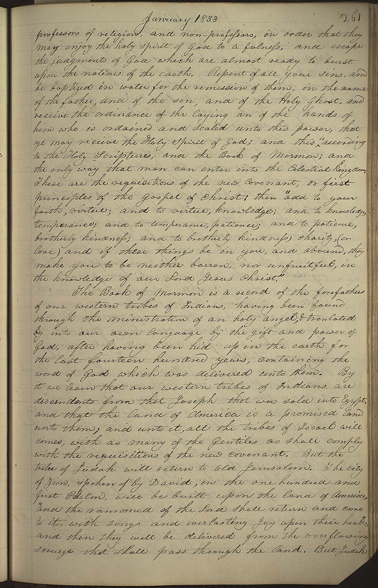 The Book of Mormon is a record of the forefathers of our western tribes of Indians, having been found through the ministration of an holy angel, & by into our own language by the gift and power of God, after having been hid up in the earth for the last fourteen hundred years, containing the word of God which was delivered unto them. By it we learn that our western tribes of Indians are desendants from that Joseph that was sold into Egypt, and that the land of America is a promised land unto them, and unto it, all the tribes of Israel will comes, with as many of the as shall comply with the requisitions of the new covenant. But the tribe of Judah will return to old Jerusalem. The , spoken of by David, in the one hundred and first Psalm, will be built upon the land of America, “and the ransomed of the Lord shall return and come to it, with songs and everlasting joy upon their heads,” and then they will be delivered from the overflowing scourge that shall pass through the land. But Judah [p. 261]
