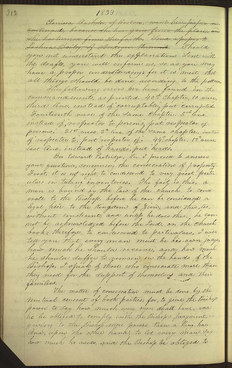 The following errors we have found in the commandments, as printed. 40th. Chapter 10 verse, third line, instead of “corruptable,” put “corrupted”. Fourteenth verse of the same Chapter. 5th line. instead of, “respecter to persons,” put “respecter of persons.” 21st. verse 2d line. of the same chapter, instead of “respecter to,” put “respecter of.” 44th. chapter, 12th verse, last line. instead of “hands”, put “heads.”