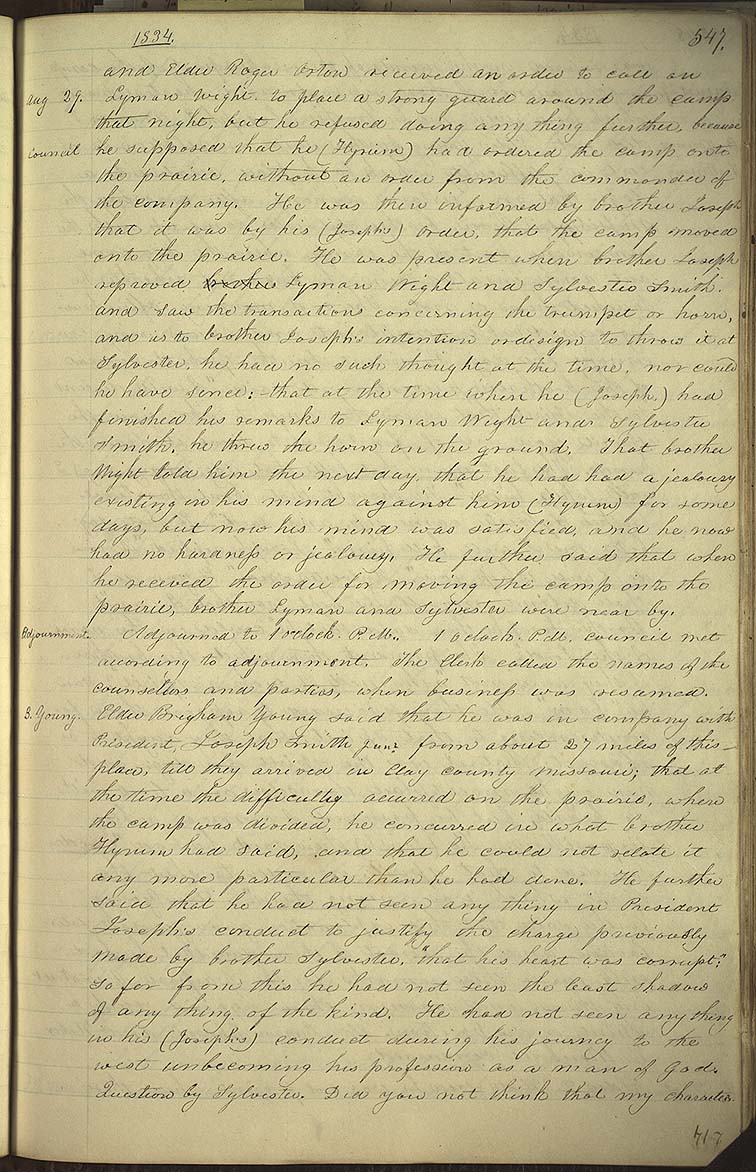 <August 29.> <Council> and received an order to call on to place a strong guard around the camp that night, but he refused doing any thing further, because he supposed that he () had ordered the onto the prairie, without an order from the commander of the company. He was then informed by brother Joseph that it was by his (Joseph’s) order, that the camp moved onto the prairie. He was present when brother Joseph reproved brothers and , and saw the transactions concerning the trumpet or horn, and as to brother Joseph’s intention or design to throw it at , he had no such thought at the time, nor could he have since:— that at the time when he (Joseph,) had finished his remarks to and , he threw the horn on the ground. That told him the next day, that he had had a jealousy existing in his mind against him () for some days, but now his mind was satisfied, and he now had no hardness or jealousy, He further said that when he receved the order for moving the camp onto the prairie, and were near by.