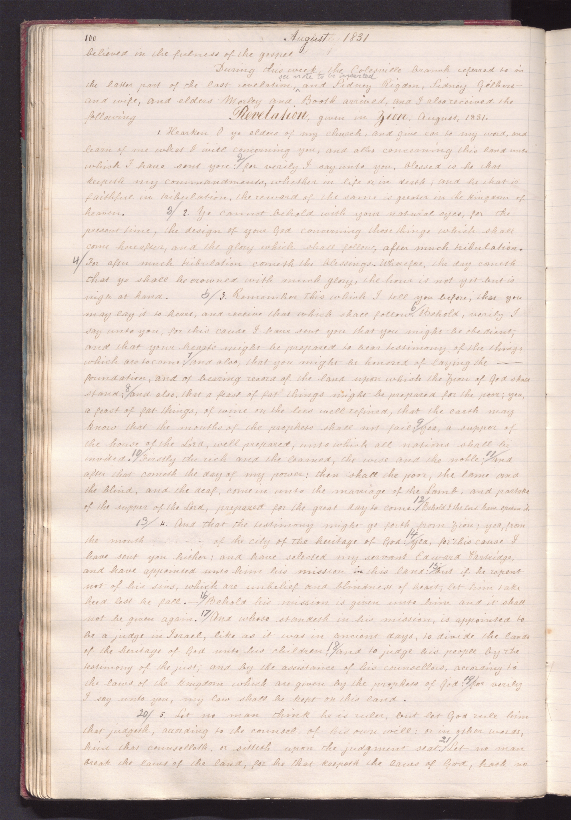 JS, History, 1838–1856, vol. A-2, created 4 Apr.–28 Nov. 1845 and 3–7 Aug. 1858; handwriting of , , , and ; 365 pages, plus seven pages of addenda; CHL. This is a copy of the first volume of a six-volume manuscript history of the church (JS History, 1838–1856, vol. A-1), and covers the period from 23 Dec. 1805 to 30 Aug. 1834. The copy also comprises four other volumes, labeled B-2, C-2, D-2, and E-2, and continues through 19 July 1843. The copy was discontinued 6 Aug. 1856 “by the advice of President ” (JS History, 1838–1856, vol. E-2, p. 83).