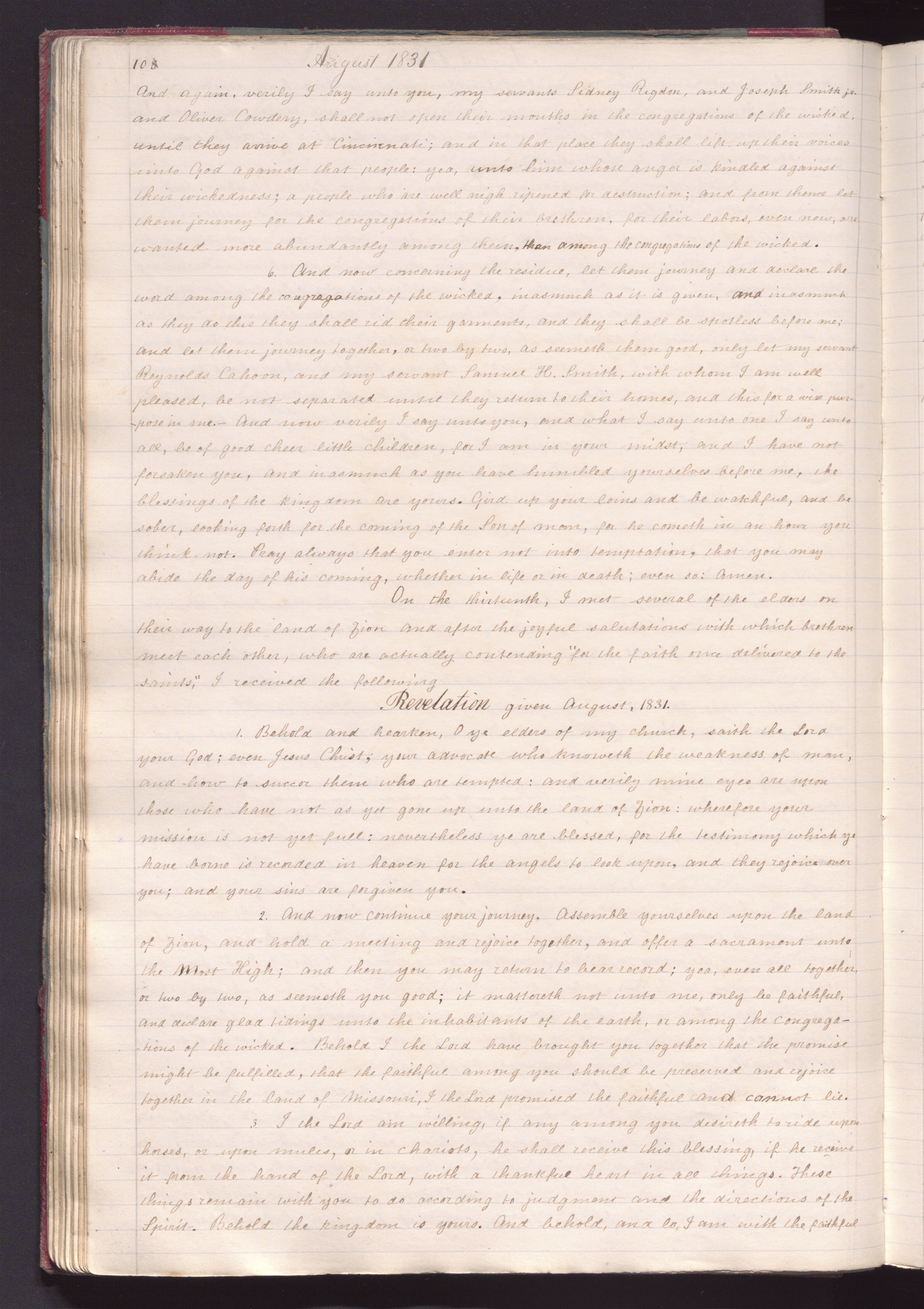 JS, History, 1838–1856, vol. A-2, created 4 Apr.–28 Nov. 1845 and 3–7 Aug. 1858; handwriting of , , , and ; 365 pages, plus seven pages of addenda; CHL. This is a copy of the first volume of a six-volume manuscript history of the church (JS History, 1838–1856, vol. A-1), and covers the period from 23 Dec. 1805 to 30 Aug. 1834. The copy also comprises four other volumes, labeled B-2, C-2, D-2, and E-2, and continues through 19 July 1843. The copy was discontinued 6 Aug. 1856 “by the advice of President ” (JS History, 1838–1856, vol. E-2, p. 83).