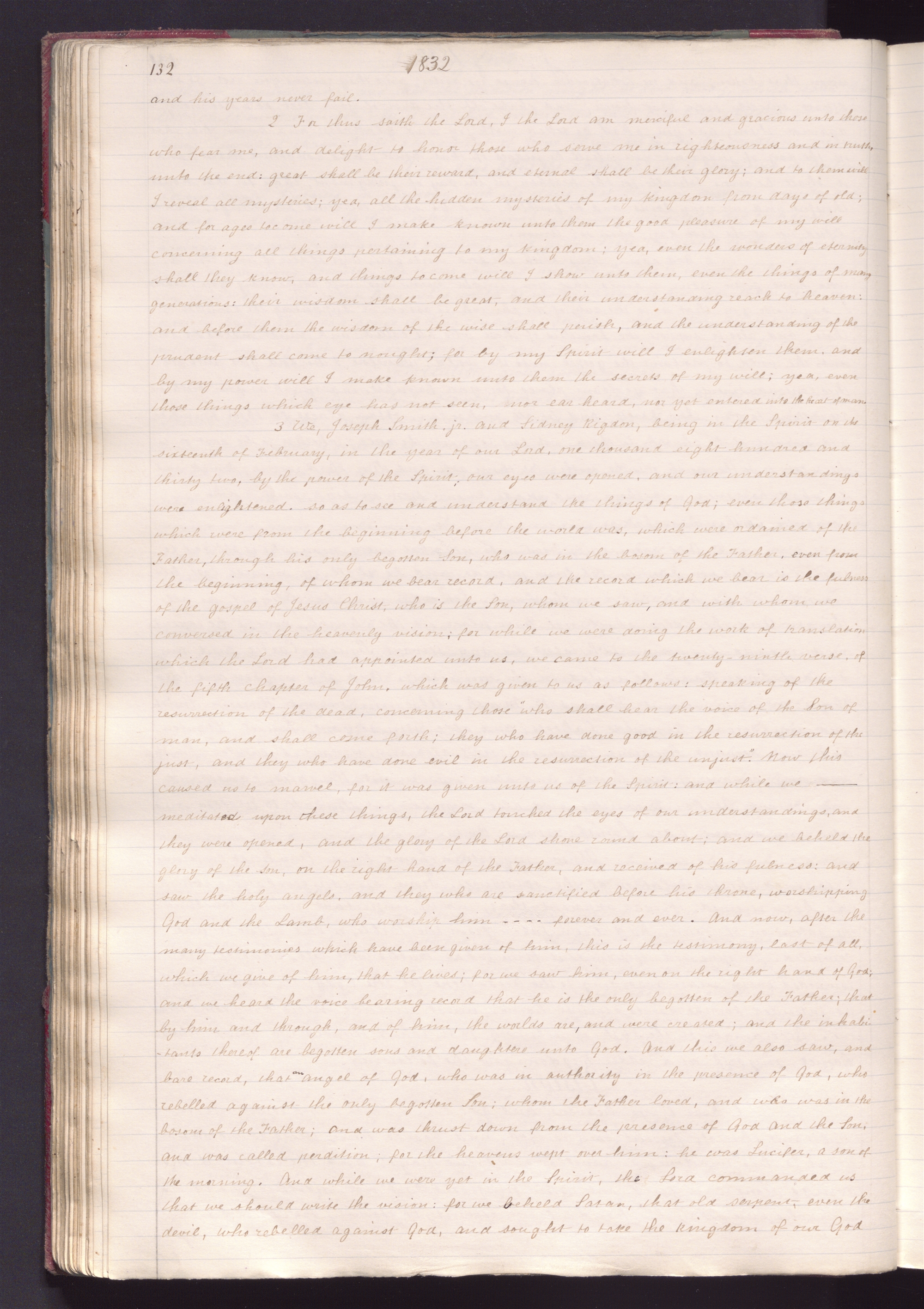 JS, History, 1838–1856, vol. A-2, created 4 Apr.–28 Nov. 1845 and 3–7 Aug. 1858; handwriting of , , , and ; 365 pages, plus seven pages of addenda; CHL. This is a copy of the first volume of a six-volume manuscript history of the church (JS History, 1838–1856, vol. A-1), and covers the period from 23 Dec. 1805 to 30 Aug. 1834. The copy also comprises four other volumes, labeled B-2, C-2, D-2, and E-2, and continues through 19 July 1843. The copy was discontinued 6 Aug. 1856 “by the advice of President ” (JS History, 1838–1856, vol. E-2, p. 83).